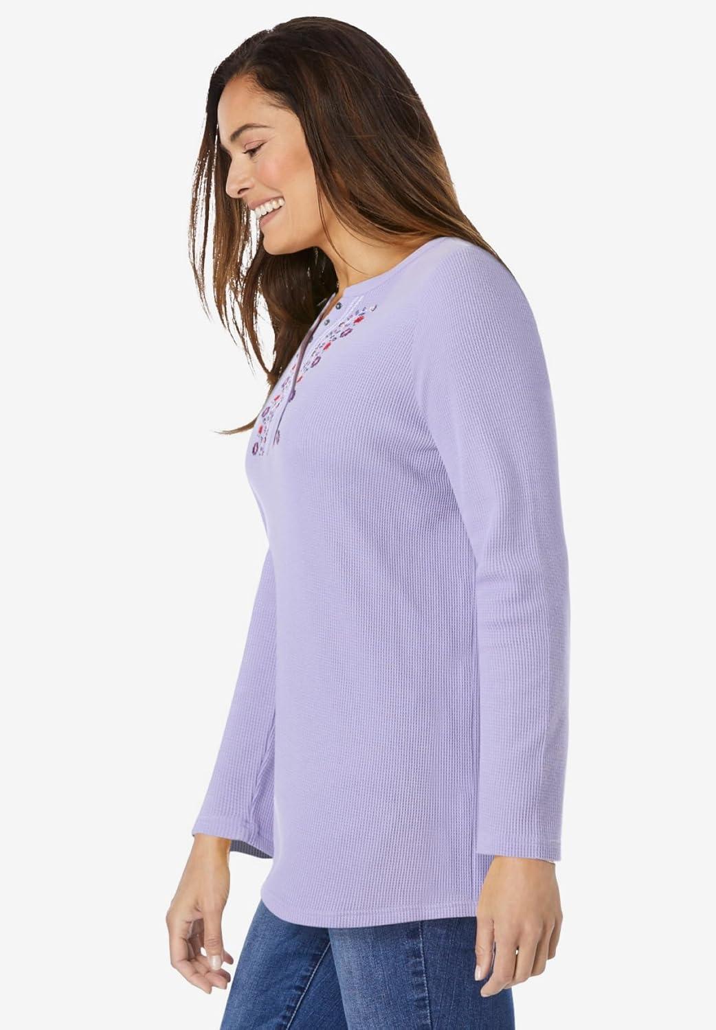 Woman Within Plus Size Embroidered Thermal Henley Tee(Soft Iris Vine Embroidery)