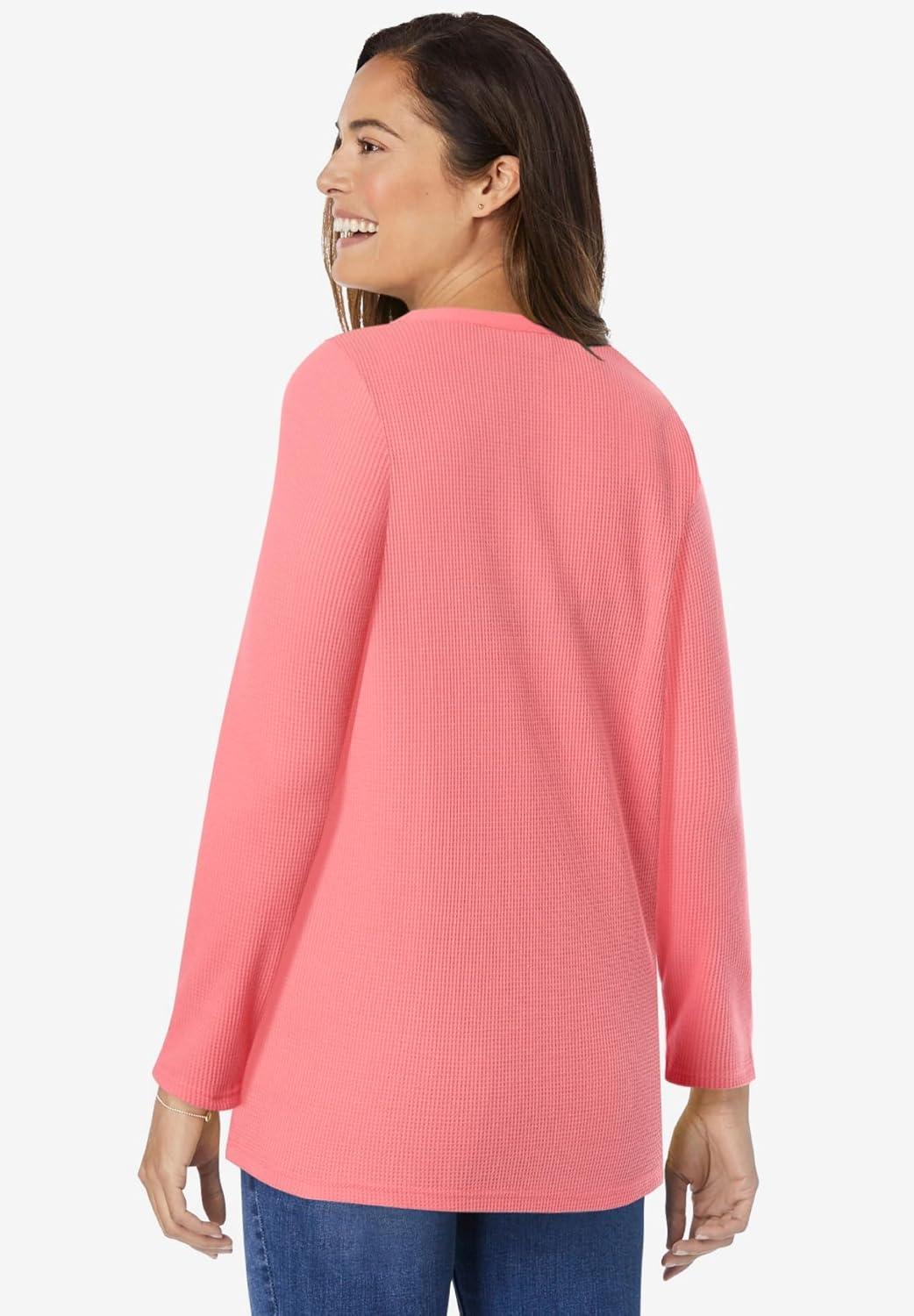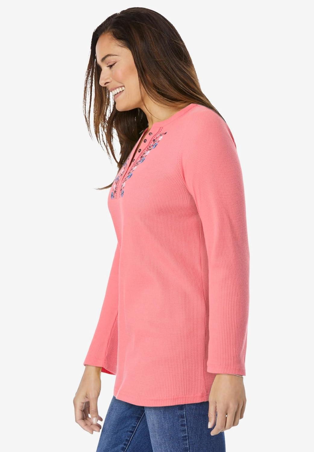 Woman Within Plus Size Embroidered Thermal Henley Tee(Sweet Coral Vine Embroidery)