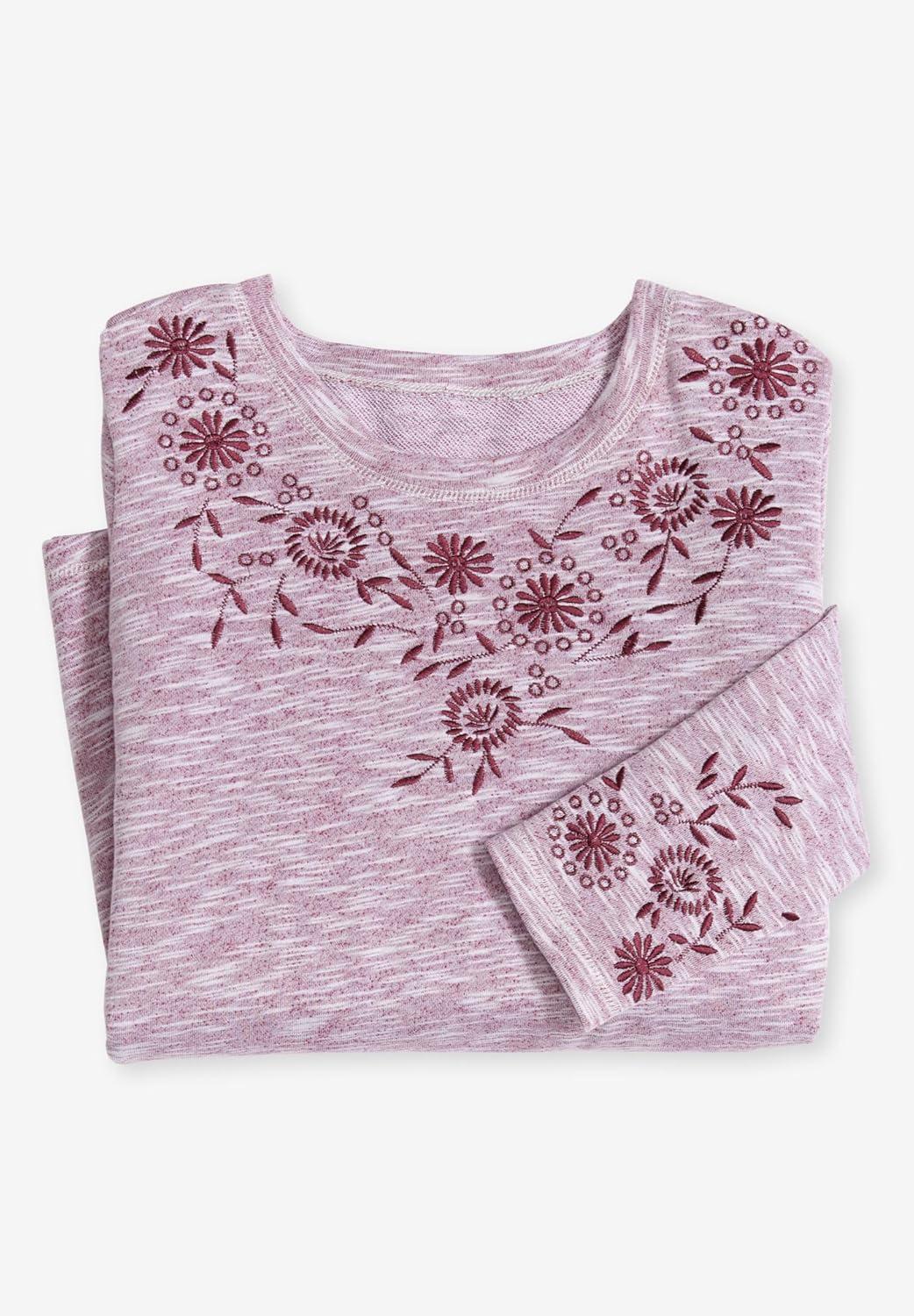 • Woman Within Plus Size Floral Embroidered Sweatshirt Tee(Deep Claret Marled Embroidery)