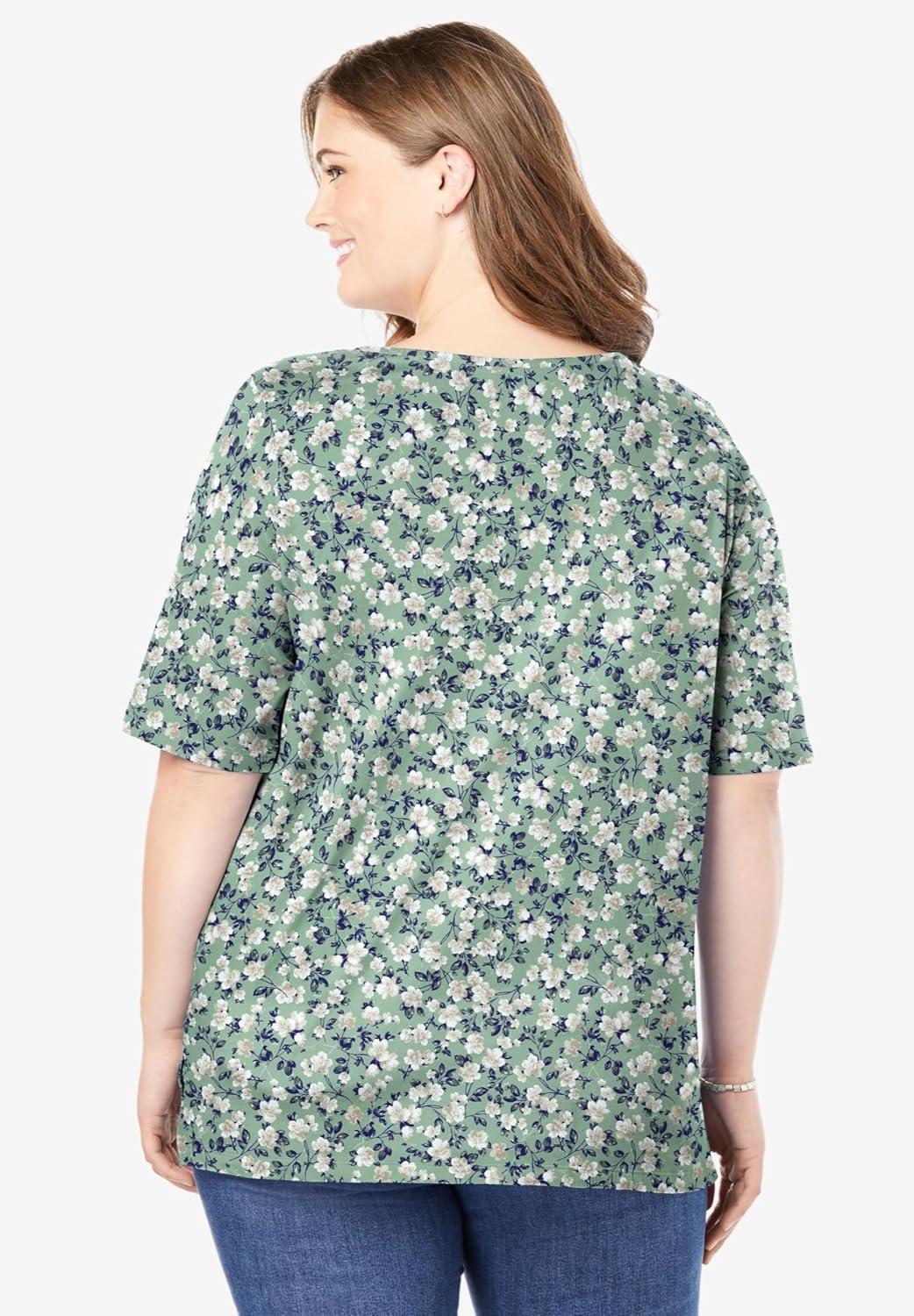 Woman Within Plus Size Printed Perfect Square-Neck Tee(Sage Blossom Vine)