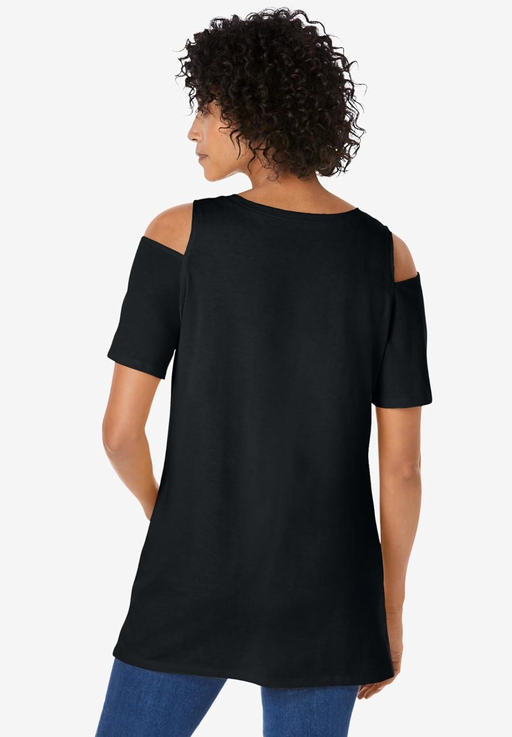 Woman Within Plus Size Short-Sleeve Cold-Shoulder Tee(Black)