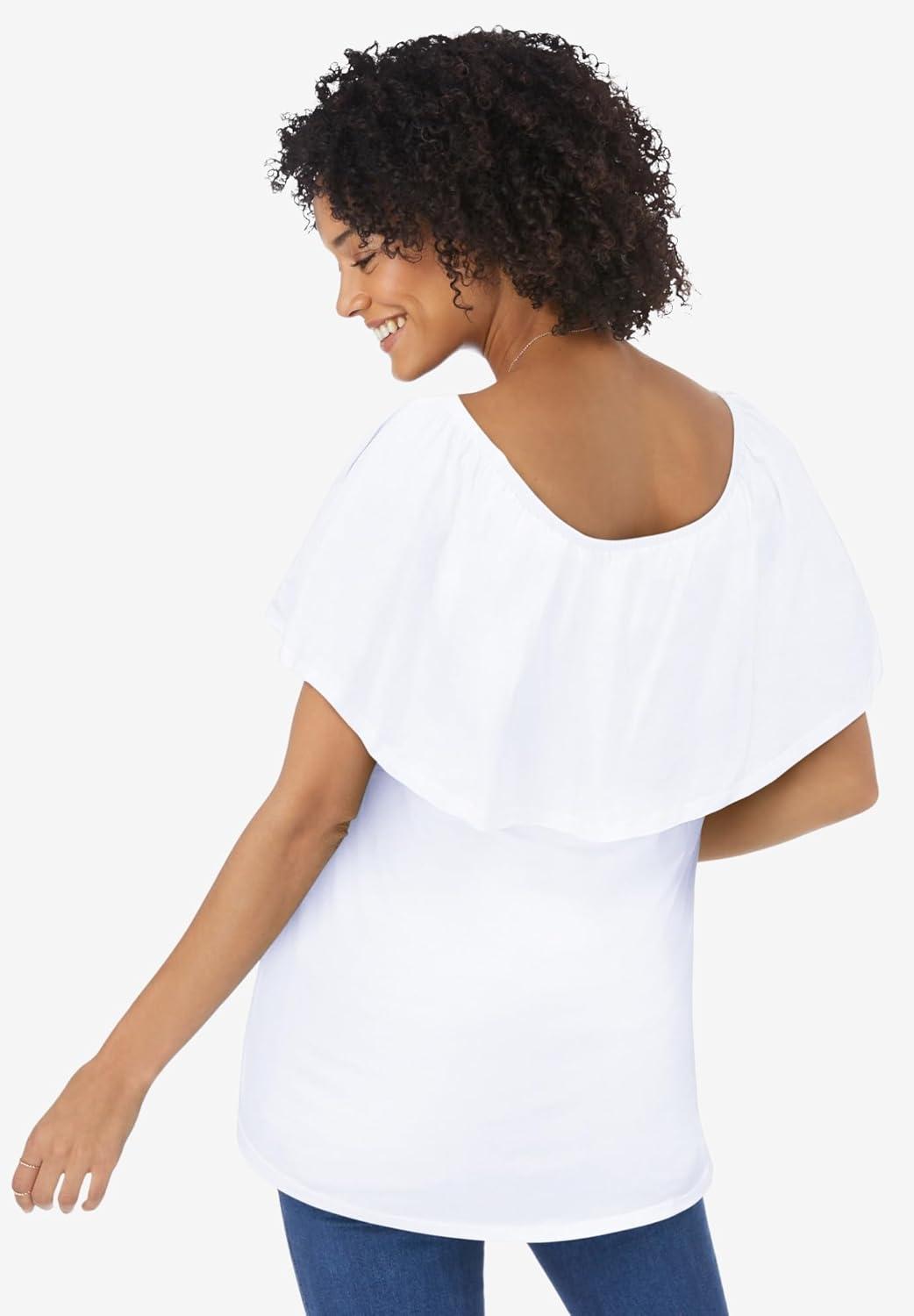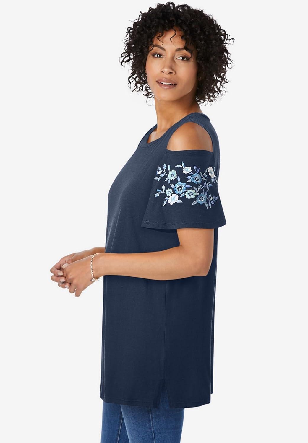 Woman Within Plus Size Short-Sleeve Cold-Shoulder Tee(White Rose Embroidery)