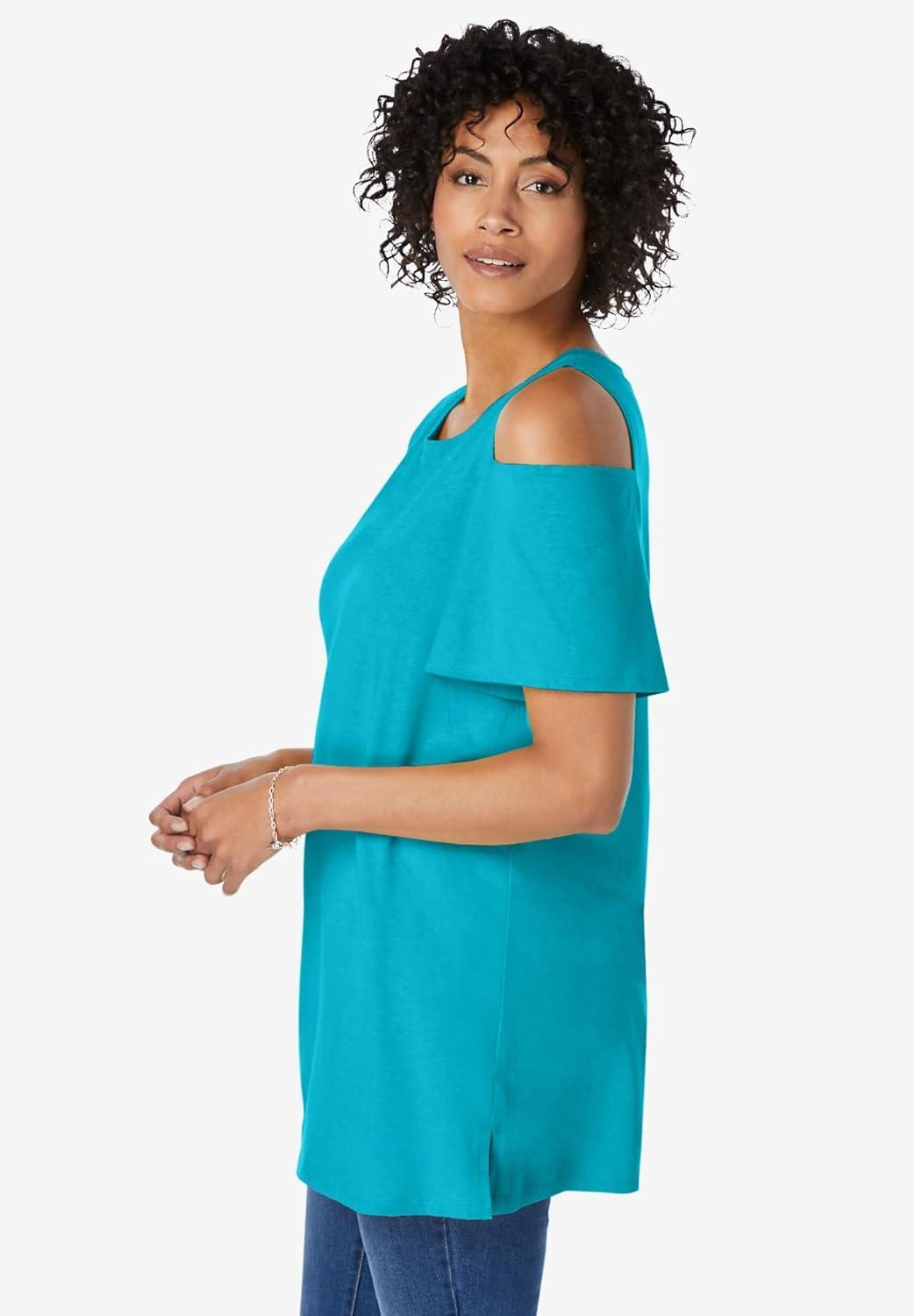 Woman Within Plus Size Short-Sleeve Cold-Shoulder Tee(Pretty Turquoise)