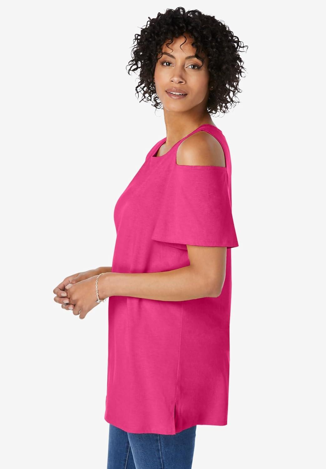 Woman Within Plus Size Short-Sleeve Cold-Shoulder Tee(Raspberry Sorbet)