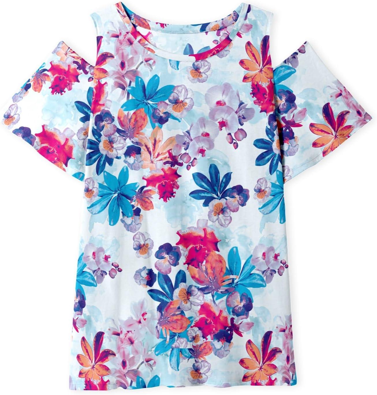 Woman Within Plus Size Short-Sleeve Cold-Shoulder Tee(White Multi Flower)