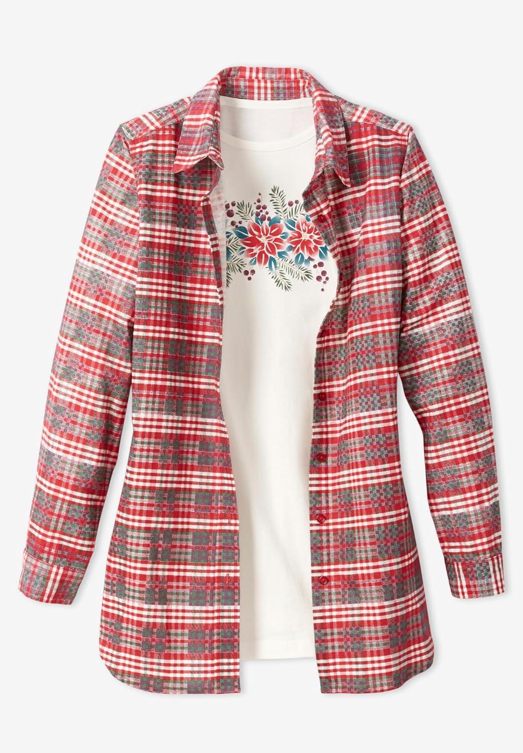 Woman Within Plus Size Two-Piece Flannel Shirt and Tee(Classic Red Winter Plaid)