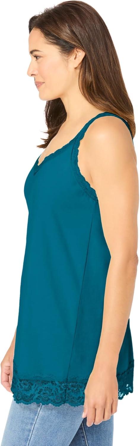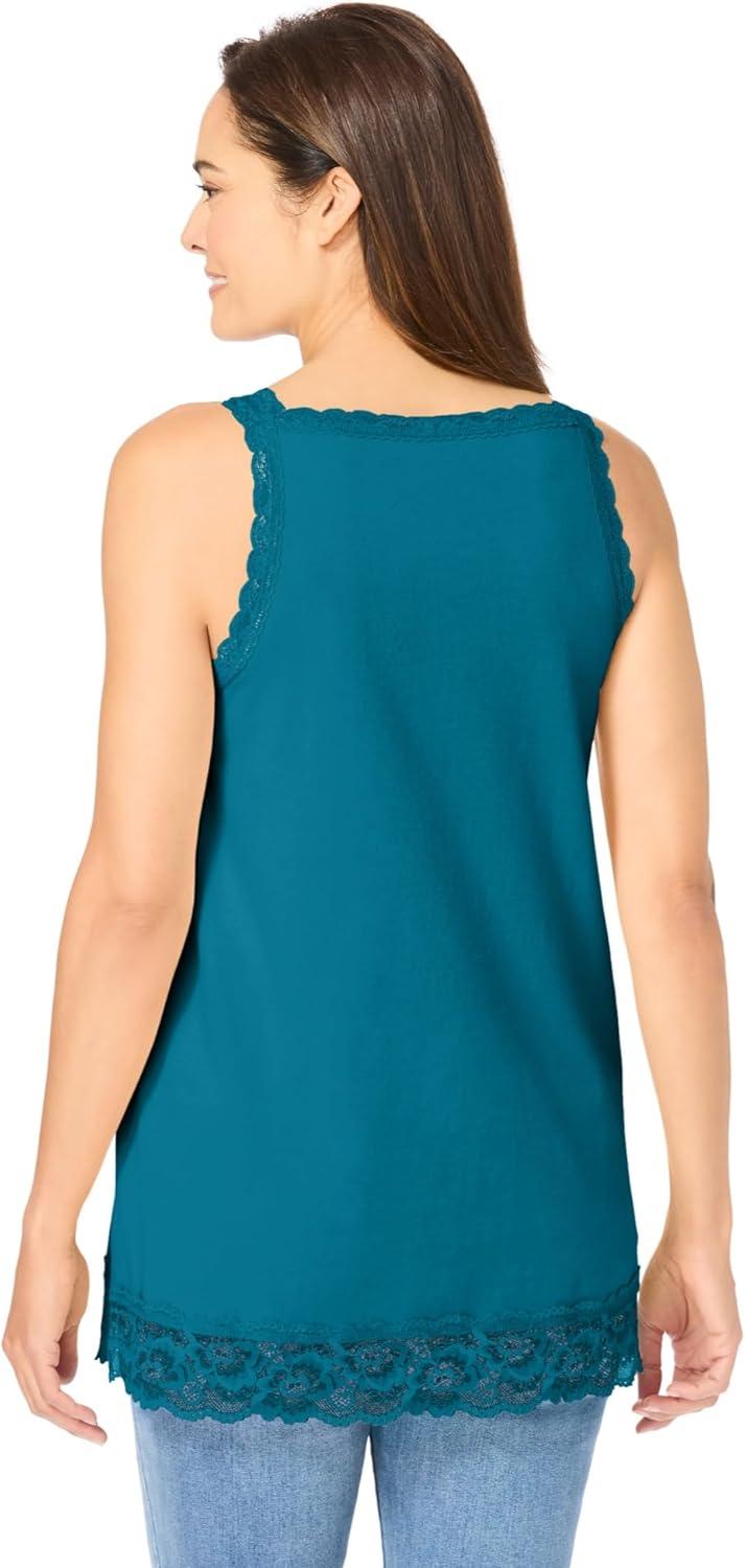 Woman Within Plus Size Lace-Trim V-Neck Tank(Deep Teal)