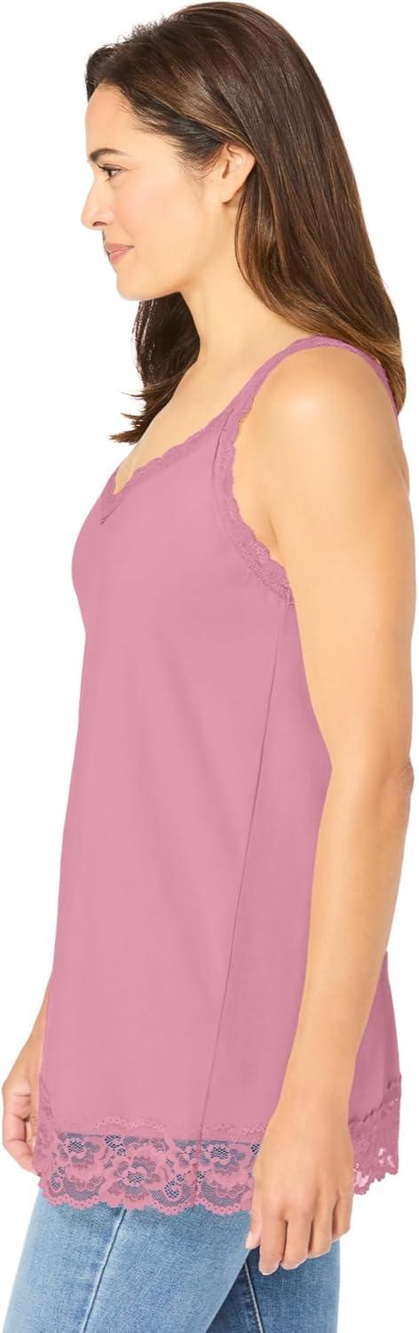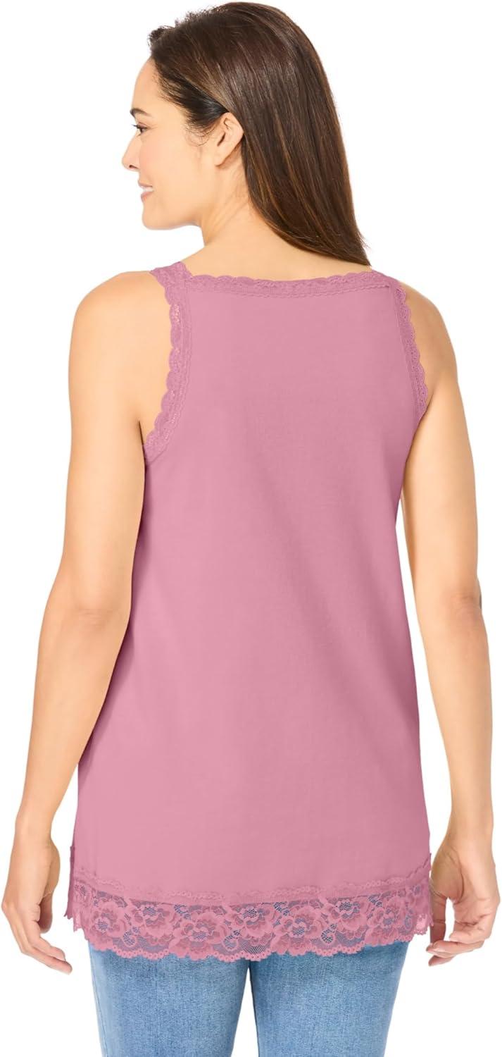 Woman Within Plus Size Lace-Trim V-Neck Tank(Pink)