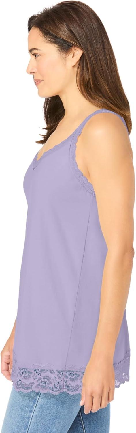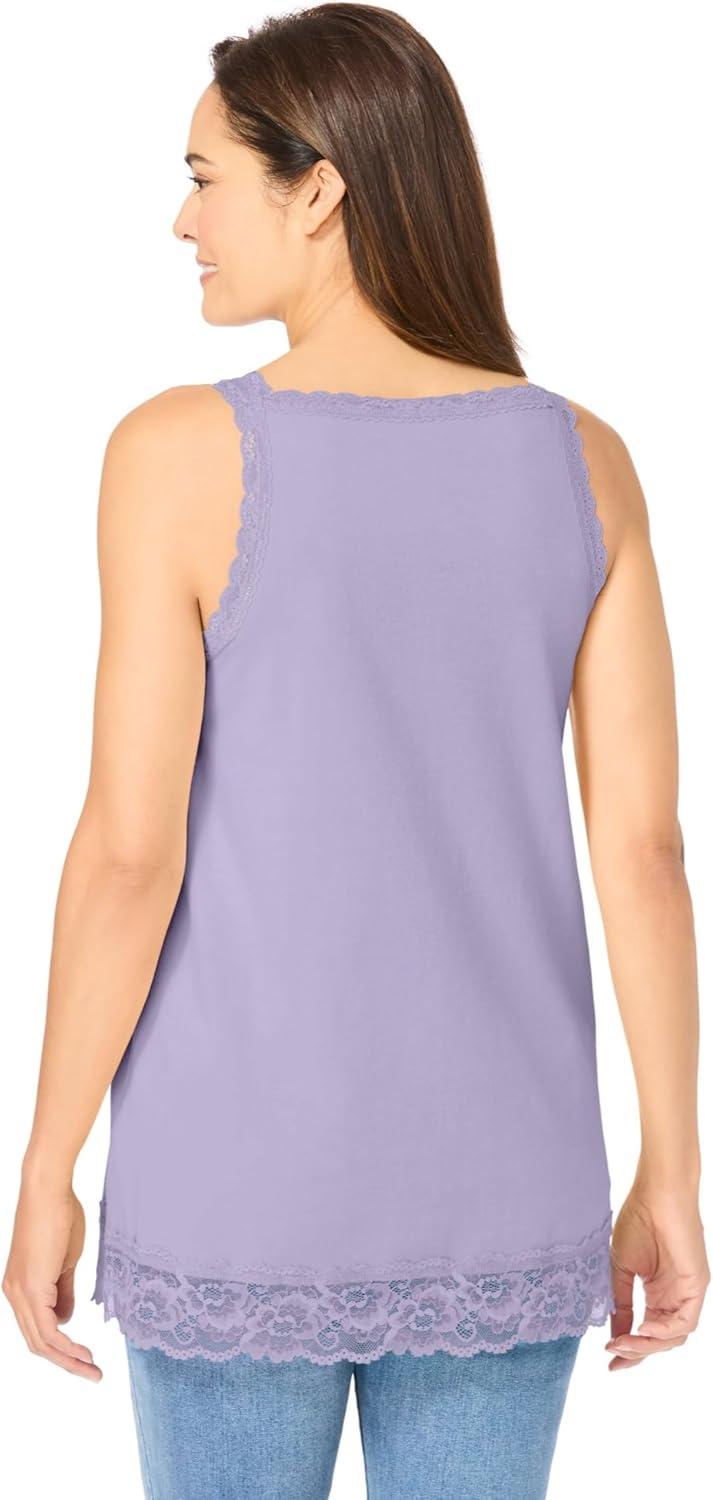 Woman Within Plus Size Lace-Trim V-Neck Tank(Pale Lilac)