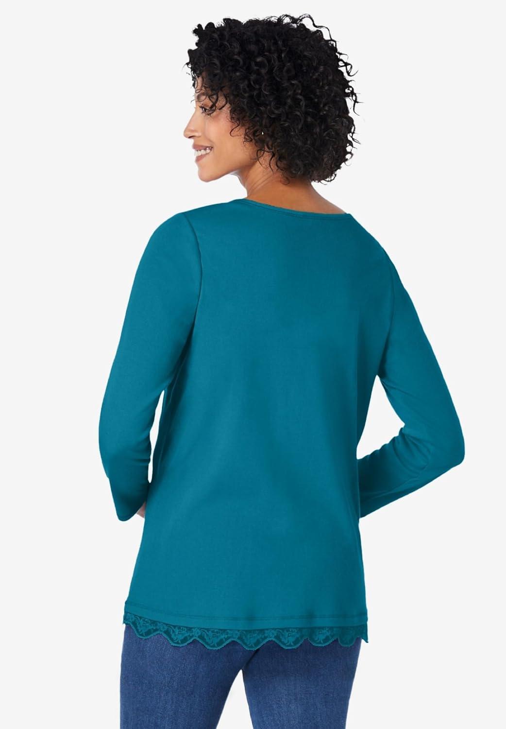 Woman Within Plus Size Layered-Look Lace Trim Tee(Deep Teal)