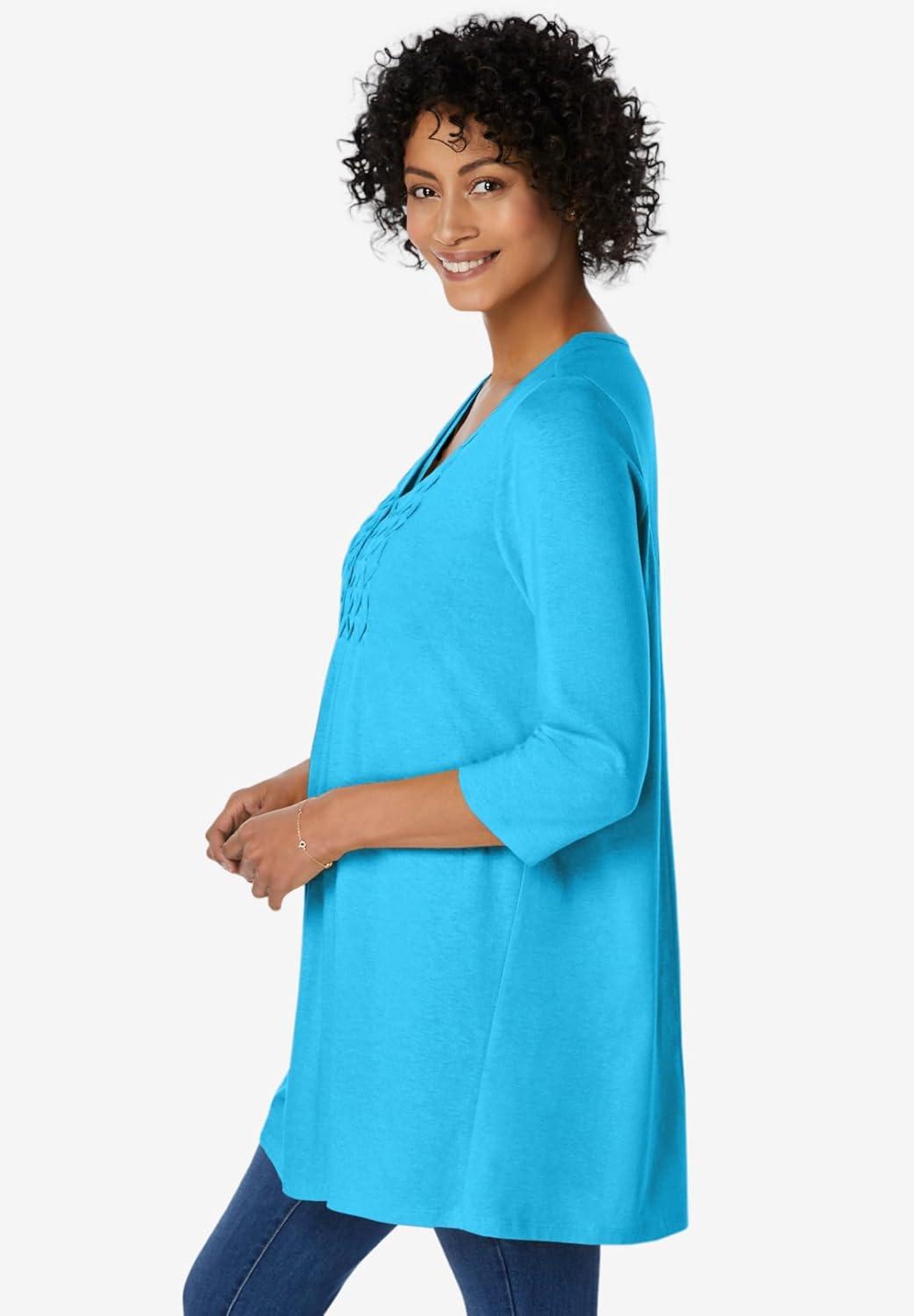 Woman Within Plus Size Smocked Henley Trapeze Tunic(Paradise Blue)