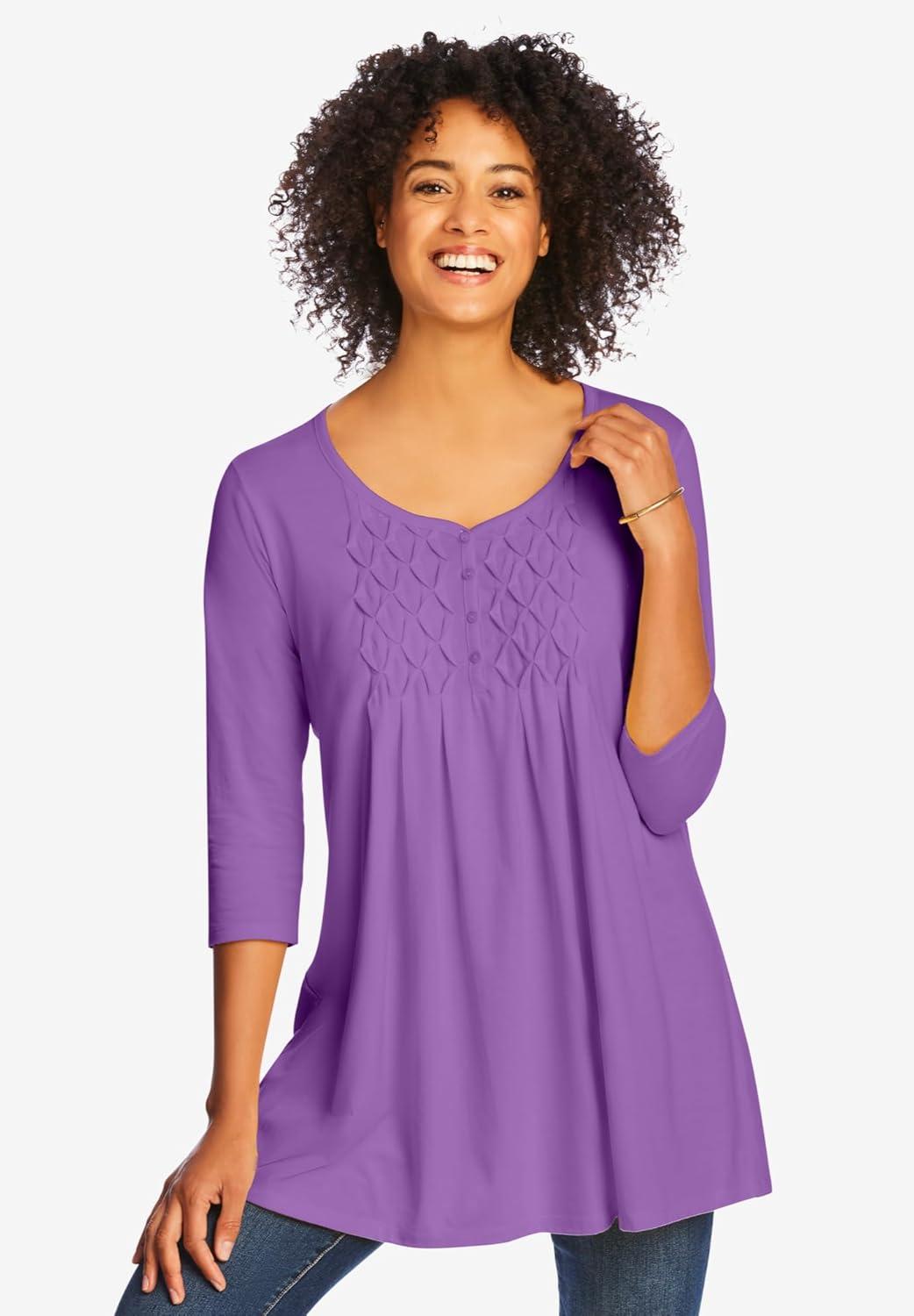 Woman Within Plus Size Smocked Henley Trapeze Tunic(Pretty Violet)