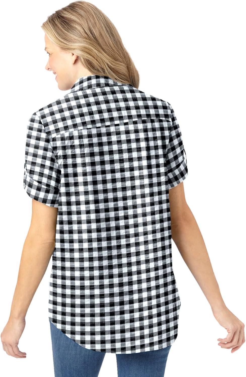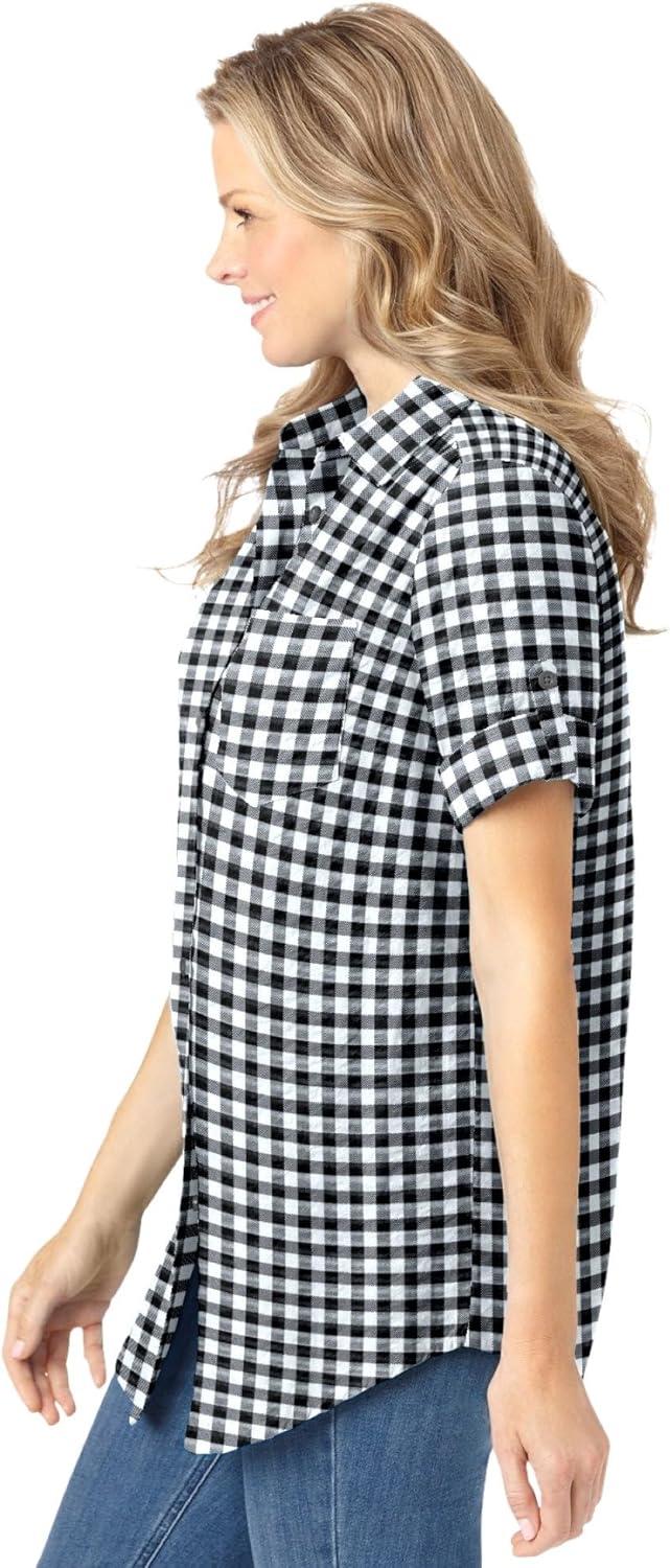 Woman Within Plus Size Petite Short-Sleeve Button-Down Cotton Seersucker Shirt(Black Gingham)