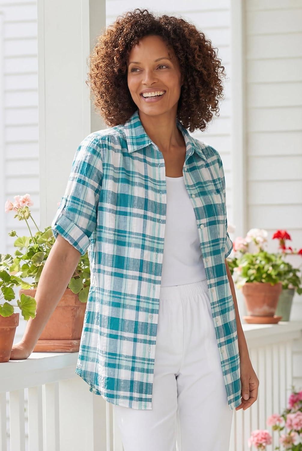Woman Within Plus Size Petite Short-Sleeve Button-Down Cotton Seersucker Shirt(Deep Teal Camp Plaid)