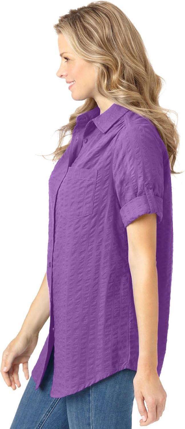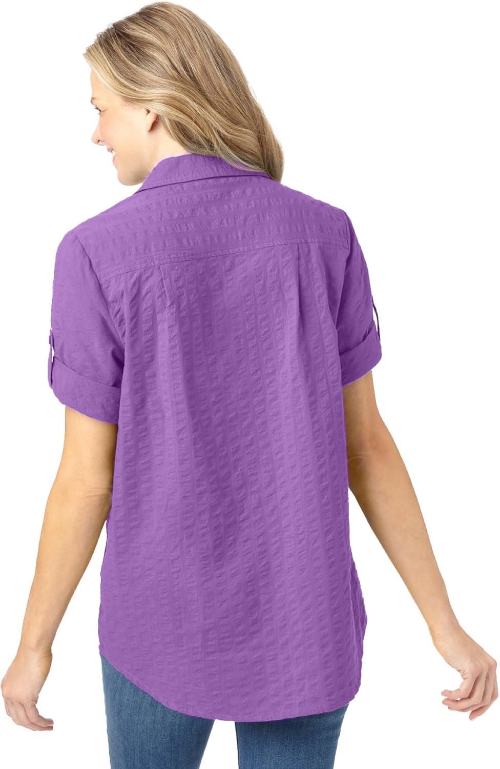 Woman Within Plus Size Petite Short-Sleeve Button-Down Cotton Seersucker Shirt(Pretty Violet)