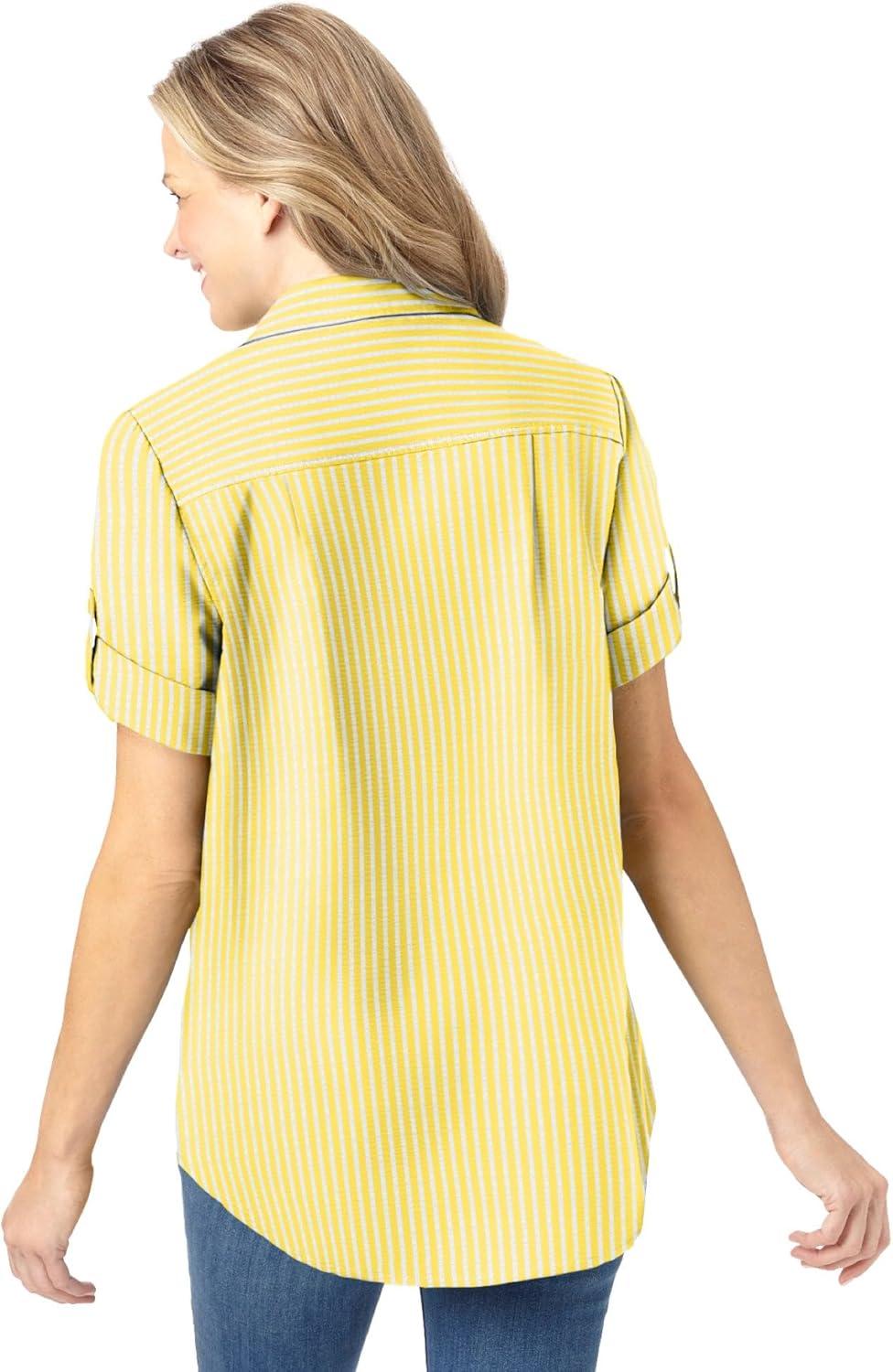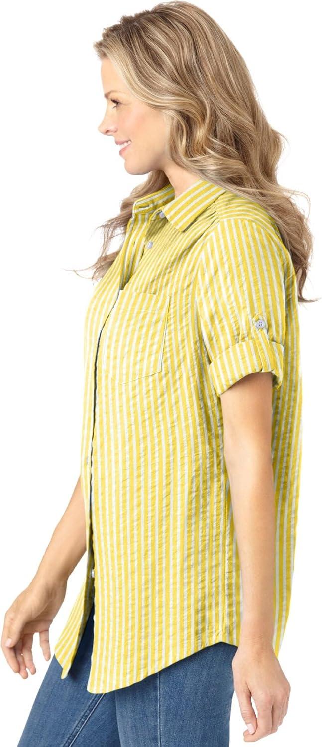 Woman Within Plus Size Petite Short-Sleeve Button-Down Cotton Seersucker Shirt(Primrose Yellow Pop Stripe)