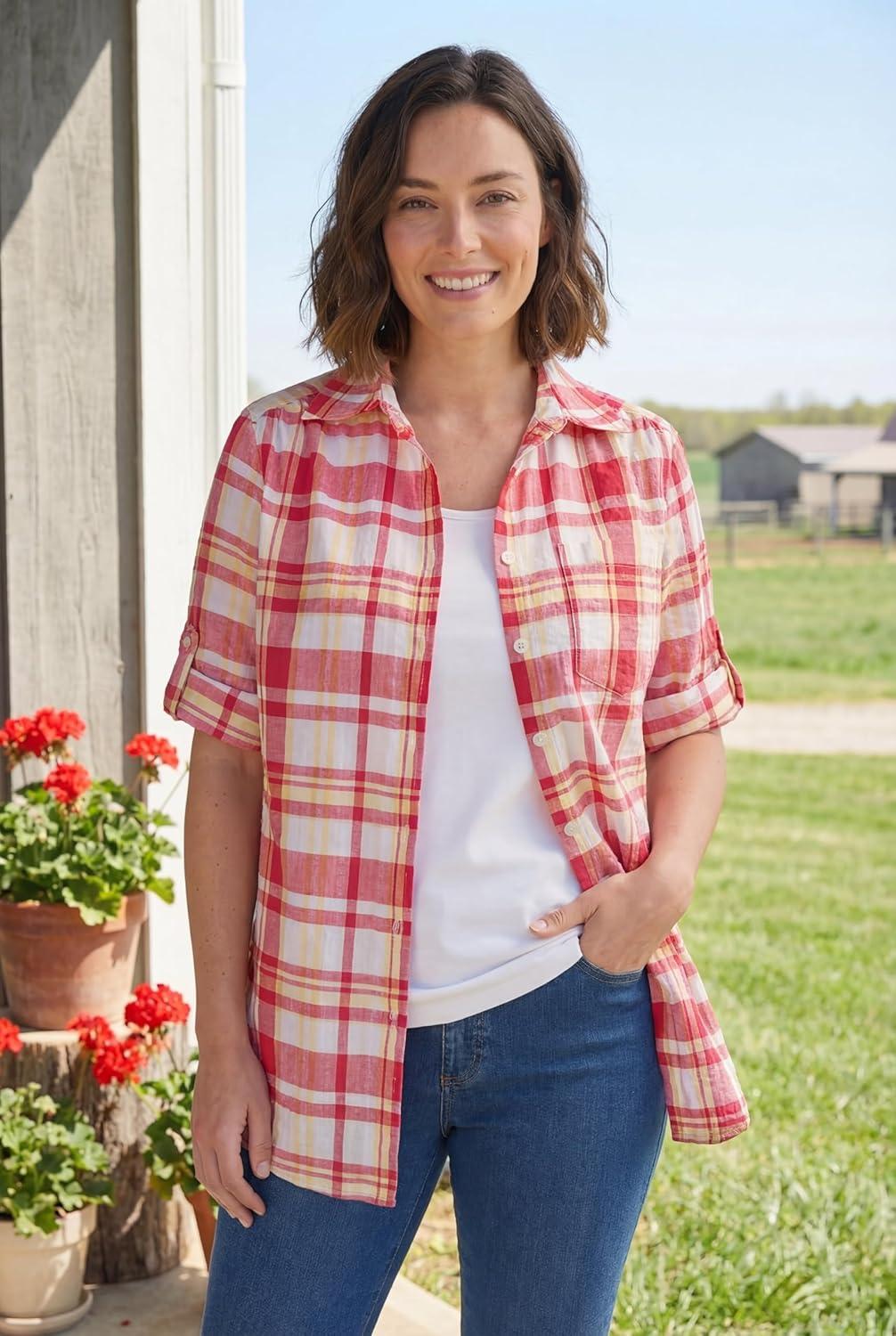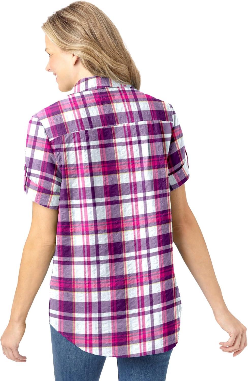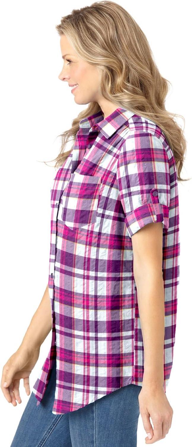 Woman Within Plus Size Petite Short-Sleeve Button-Down Cotton Seersucker Shirt(Raspberry Sorbet Camp Plaid)