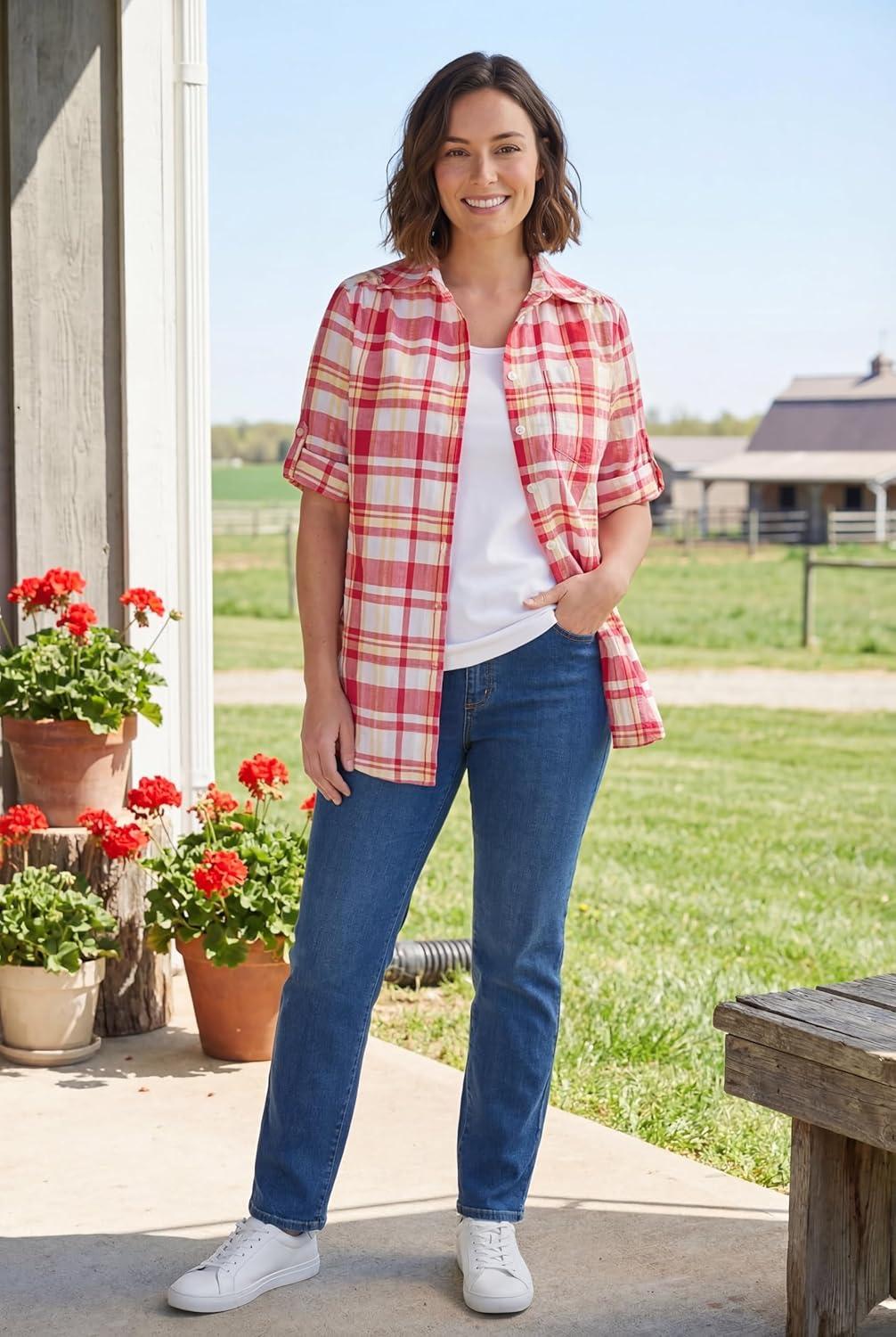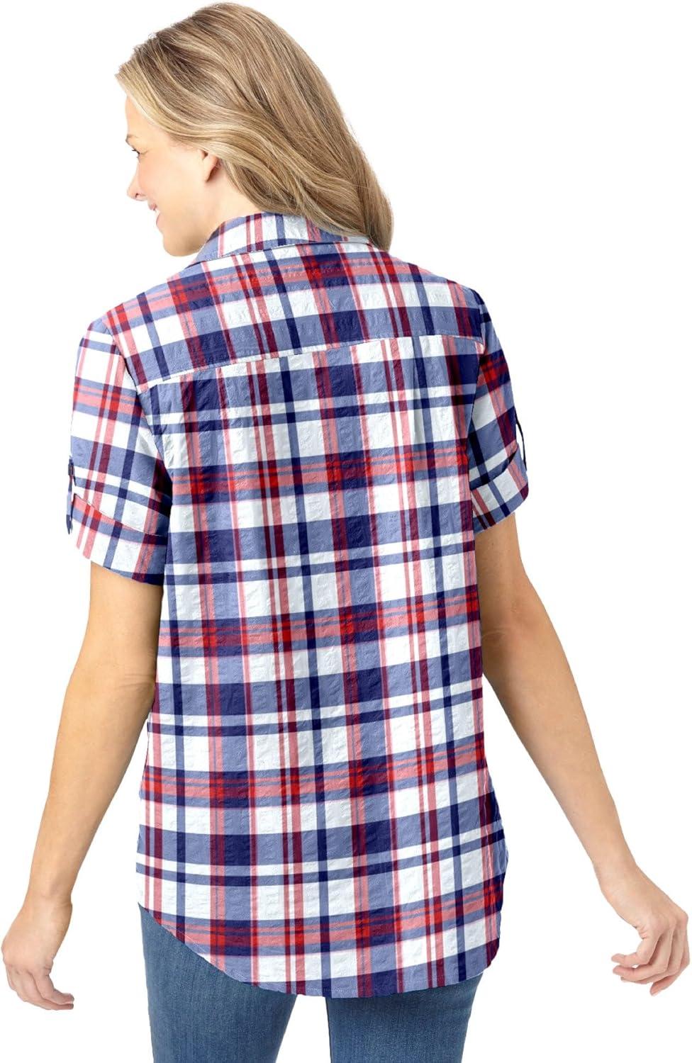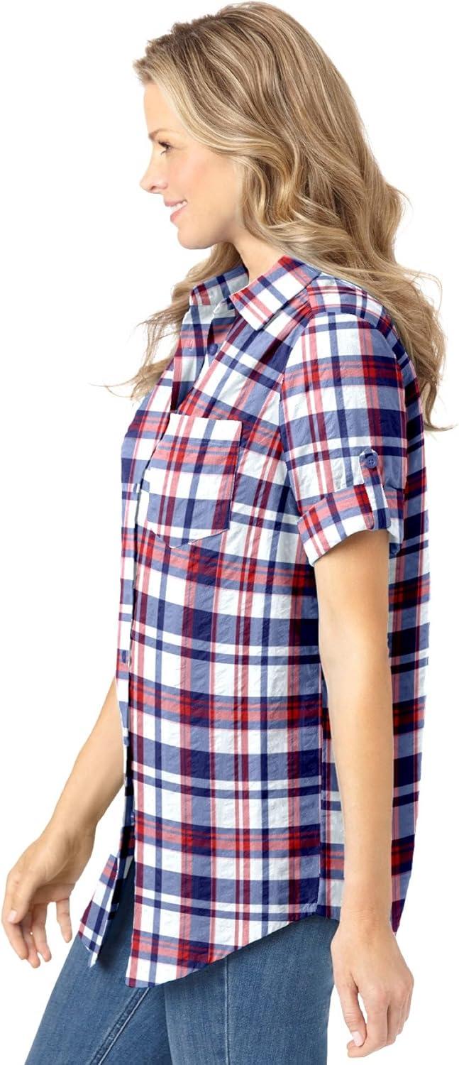 Woman Within Plus Size Petite Short-Sleeve Button-Down Cotton Seersucker Shirt(Red White Blue Plaid)
