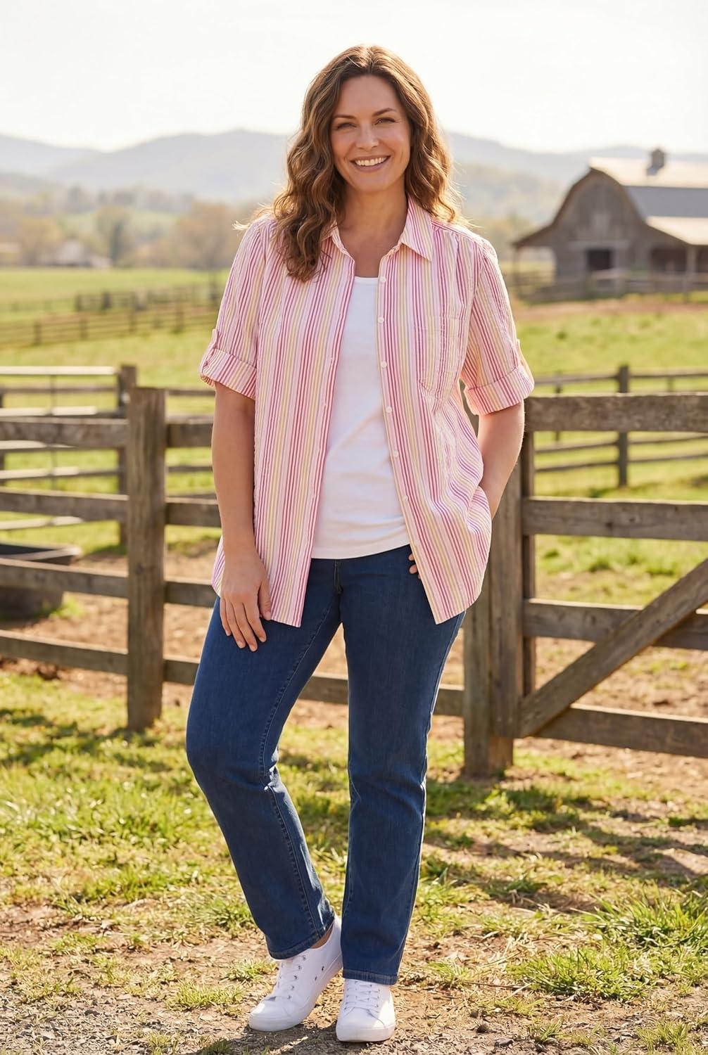 Woman Within Plus Size Petite Short-Sleeve Button-Down Cotton Seersucker Shirt(Raspberry Sorbet Pop Stripe)