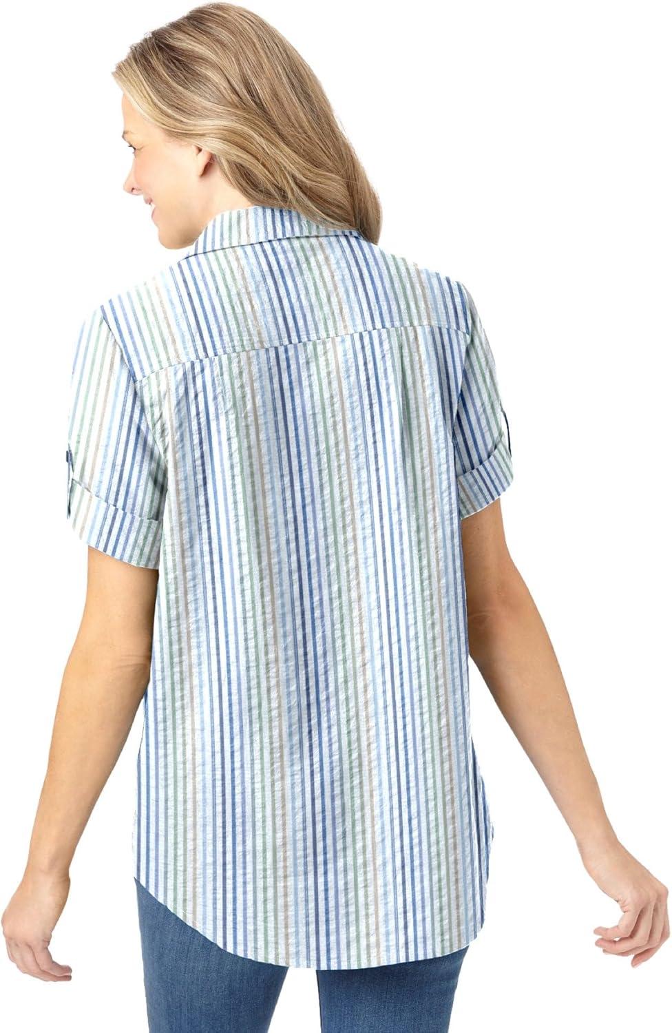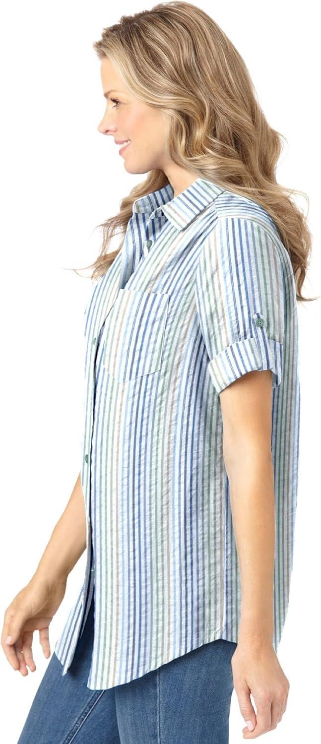 Woman Within Plus Size Petite Short-Sleeve Button-Down Cotton Seersucker Shirt(Grass Stripe)