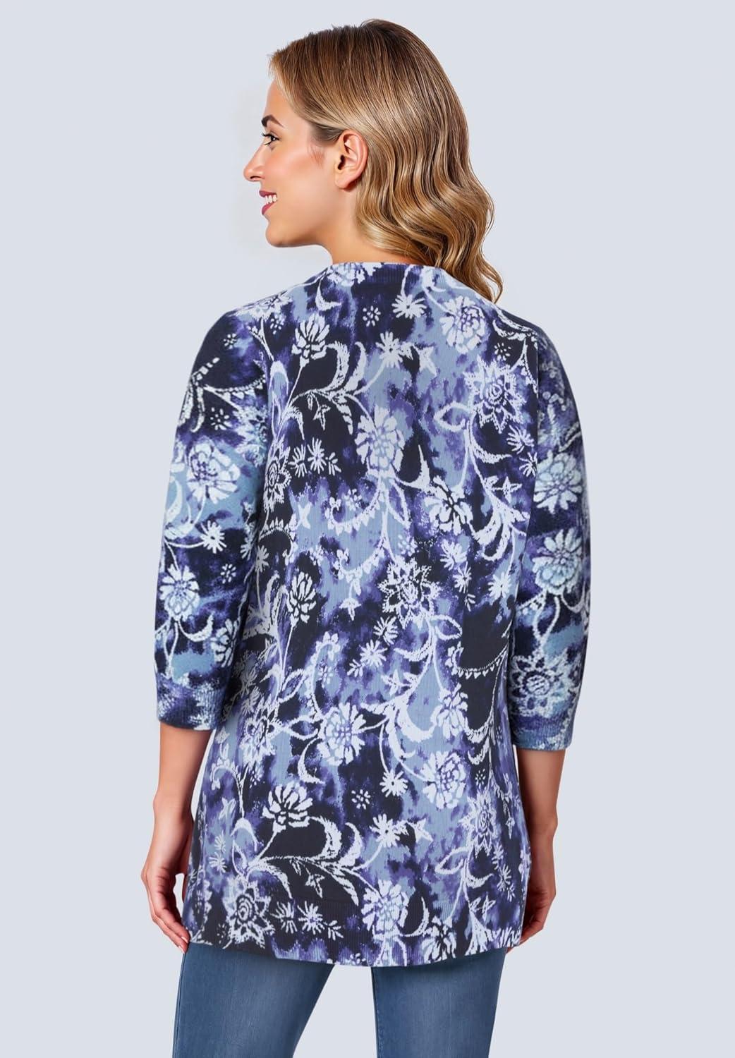 Woman Within Plus Size Perfect Long-Sleeve Cardigan Sweater(Navy Floral Tie Dye)