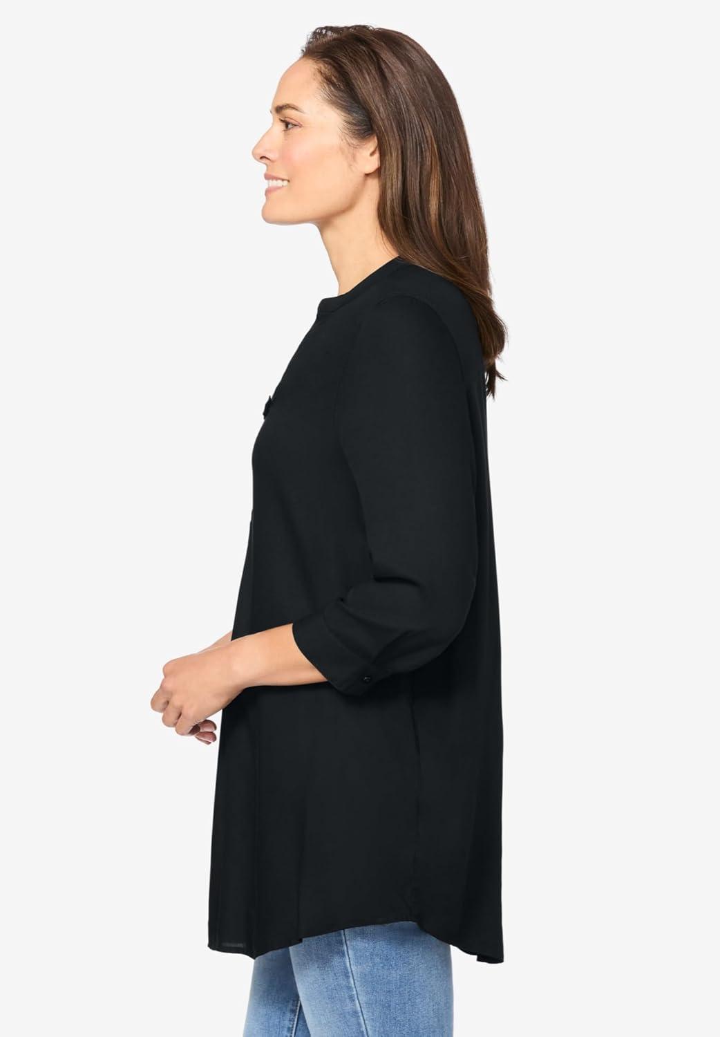 Woman Within Plus Size Rayon Three-Quarter Sleeve Effortless Tab-Front Blouse(Black)