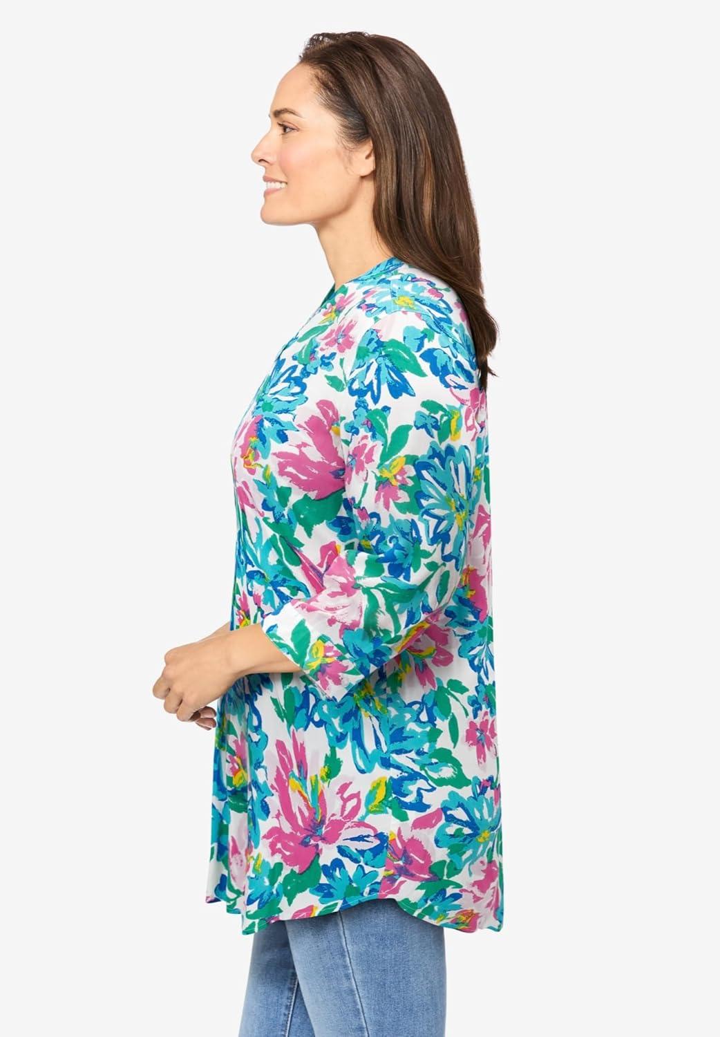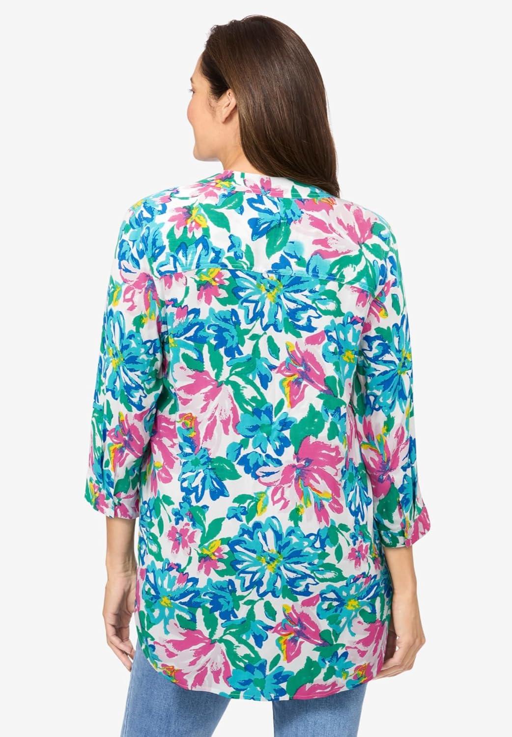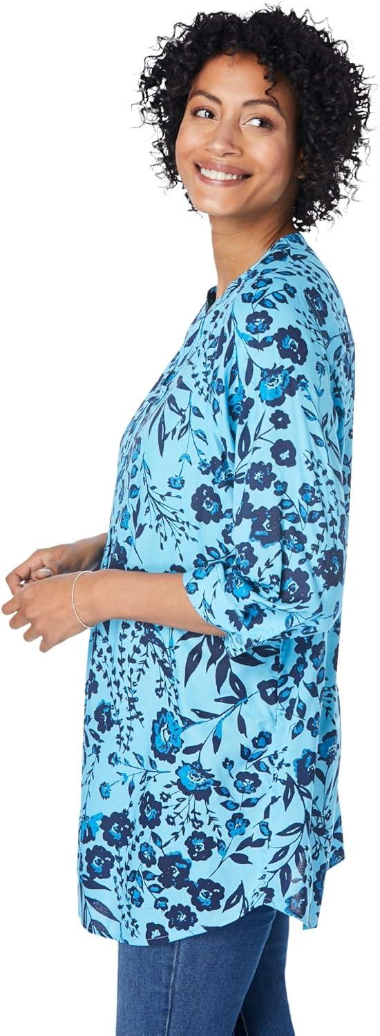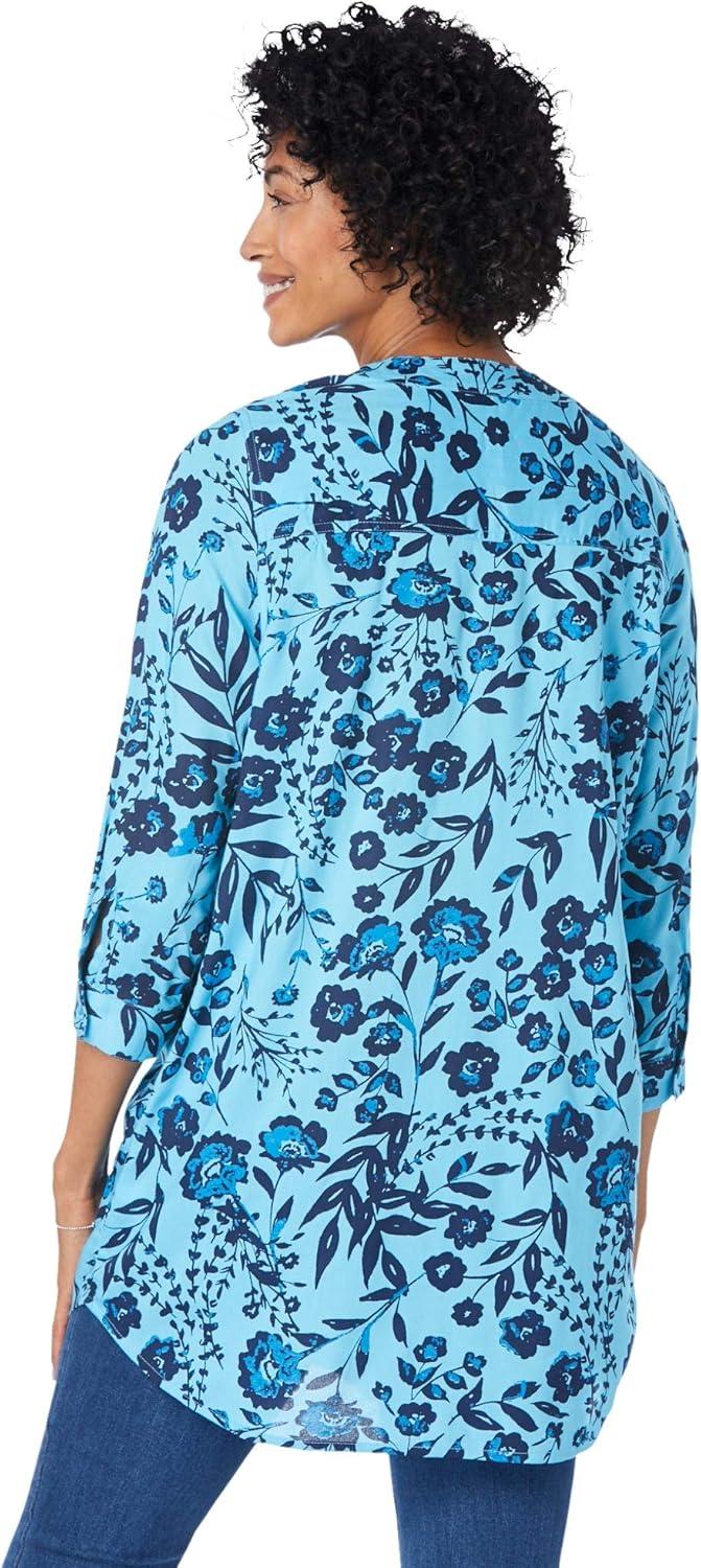 Woman Within Plus Size Rayon Three-Quarter Sleeve Effortless Tab-Front Blouse(White Blue Painted Floral)