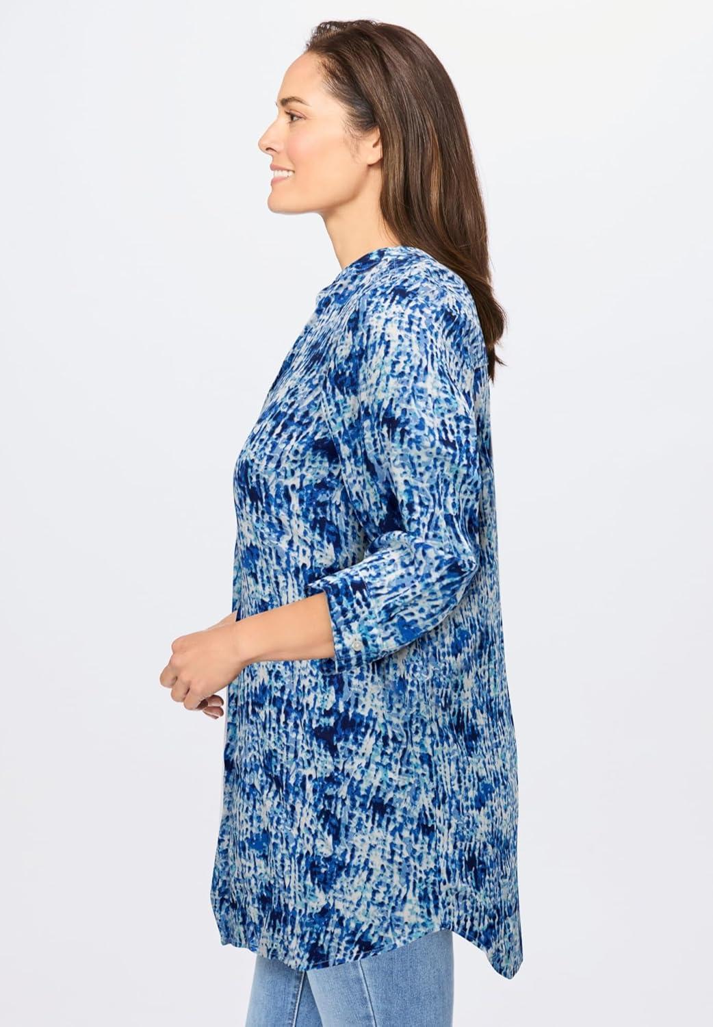 Woman Within Plus Size Rayon Three-Quarter Sleeve Effortless Tab-Front Blouse(Navy Texture Tie Dye)