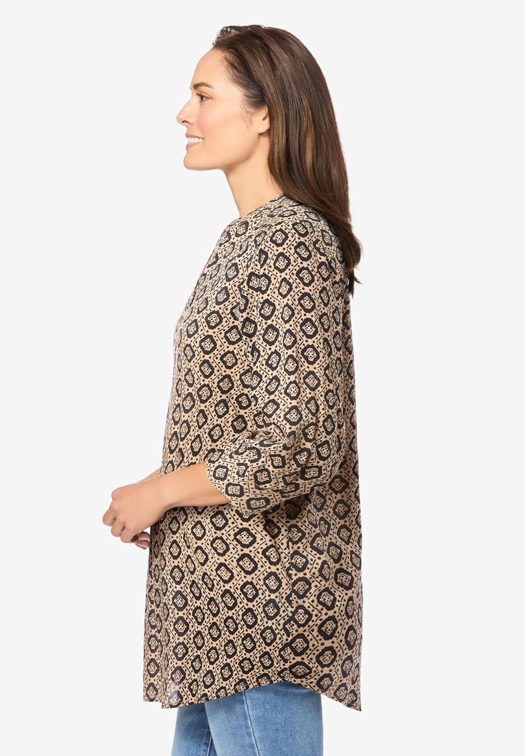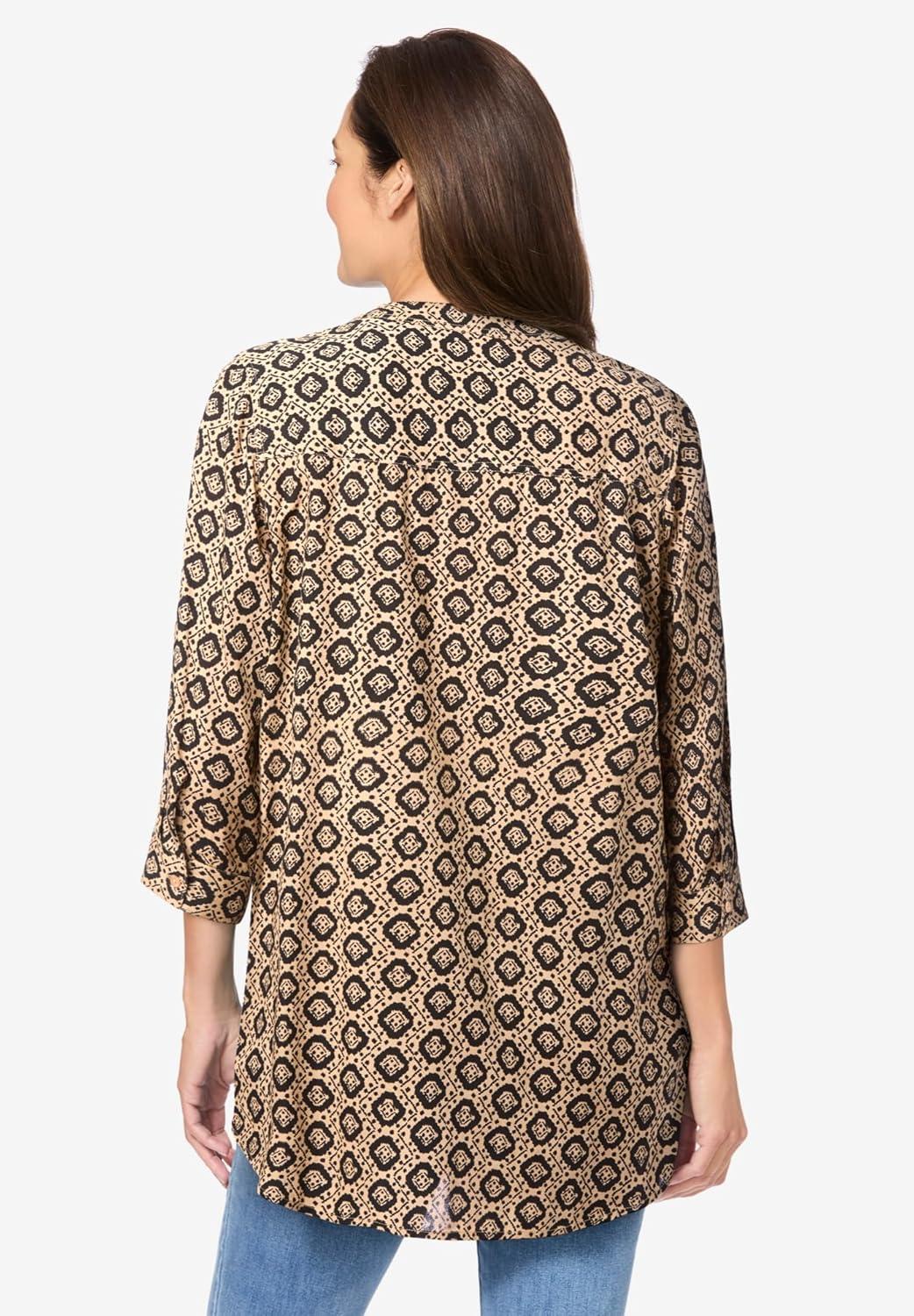 Woman Within Plus Size Rayon Three-Quarter Sleeve Effortless Tab-Front Blouse(New Khaki Geo)