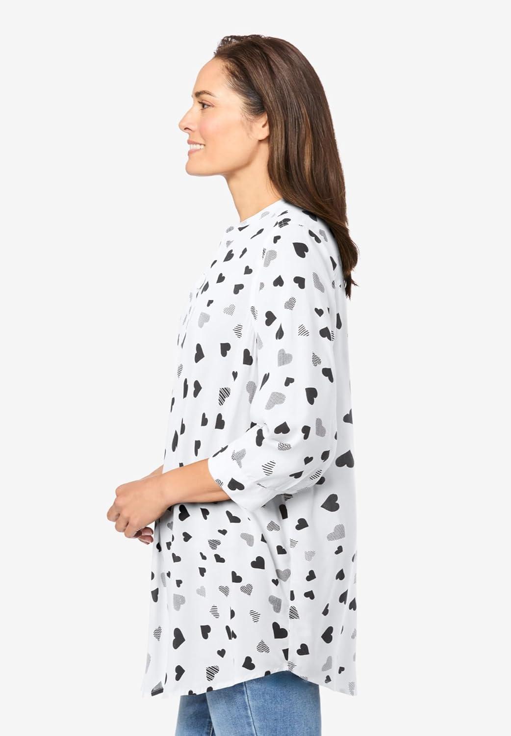 Woman Within Plus Size Rayon Three-Quarter Sleeve Effortless Tab-Front Blouse(White Heart Stencil)