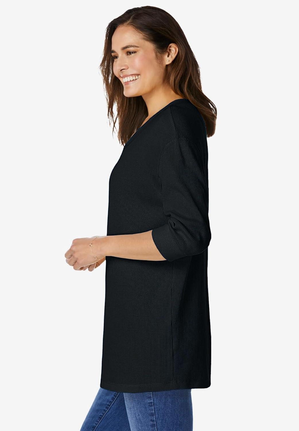 Woman Within Plus Size Three-Quarter Sleeve Thermal Sweatshirt(Black)