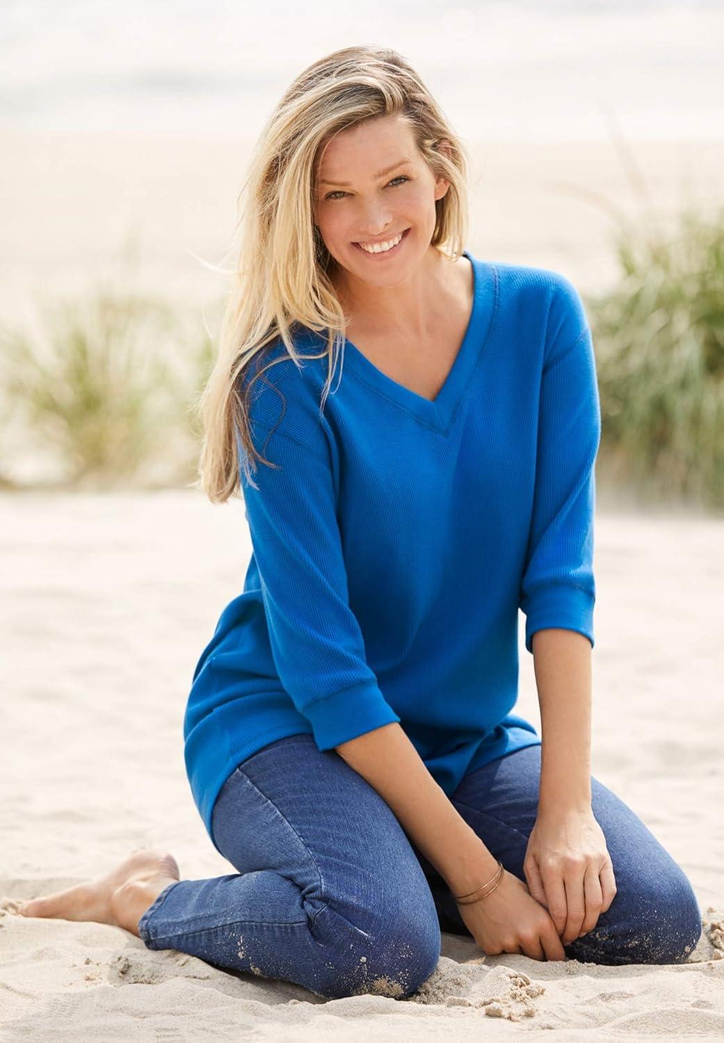Woman Within Plus Size Three-Quarter Sleeve Thermal Sweatshirt(Bright Cobalt)