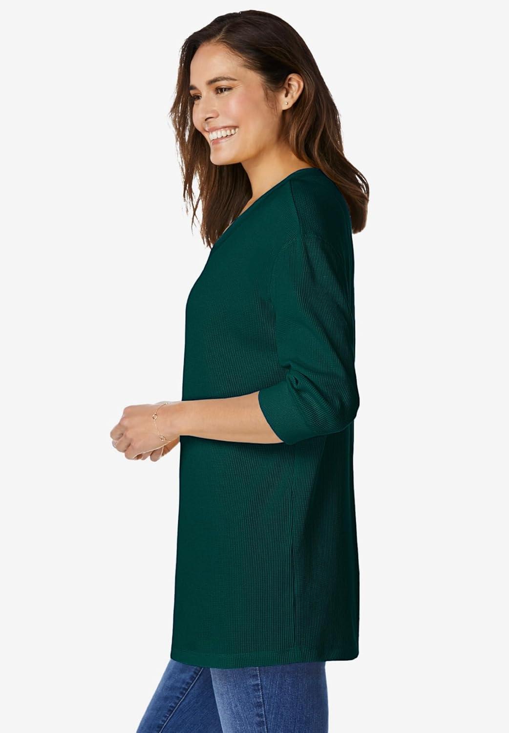 Woman Within Plus Size Three-Quarter Sleeve Thermal Sweatshirt(Emerald Green)