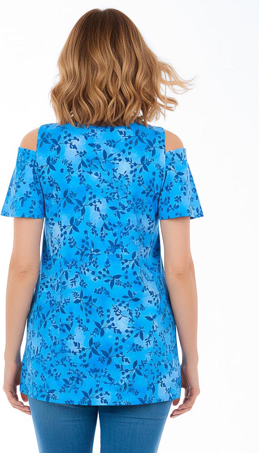 Woman Within Plus Size Short-Sleeve Cold-Shoulder Tee(Pretty Turquoise Dot)