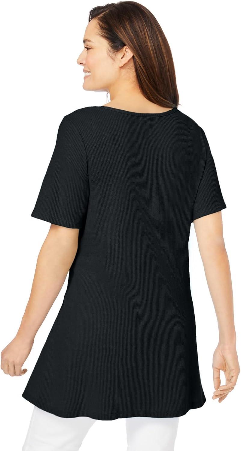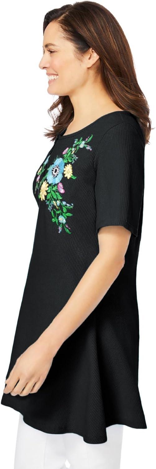 Woman Within Plus Size Embroidered Thermal Tunic(Black Blooming Embroidery)