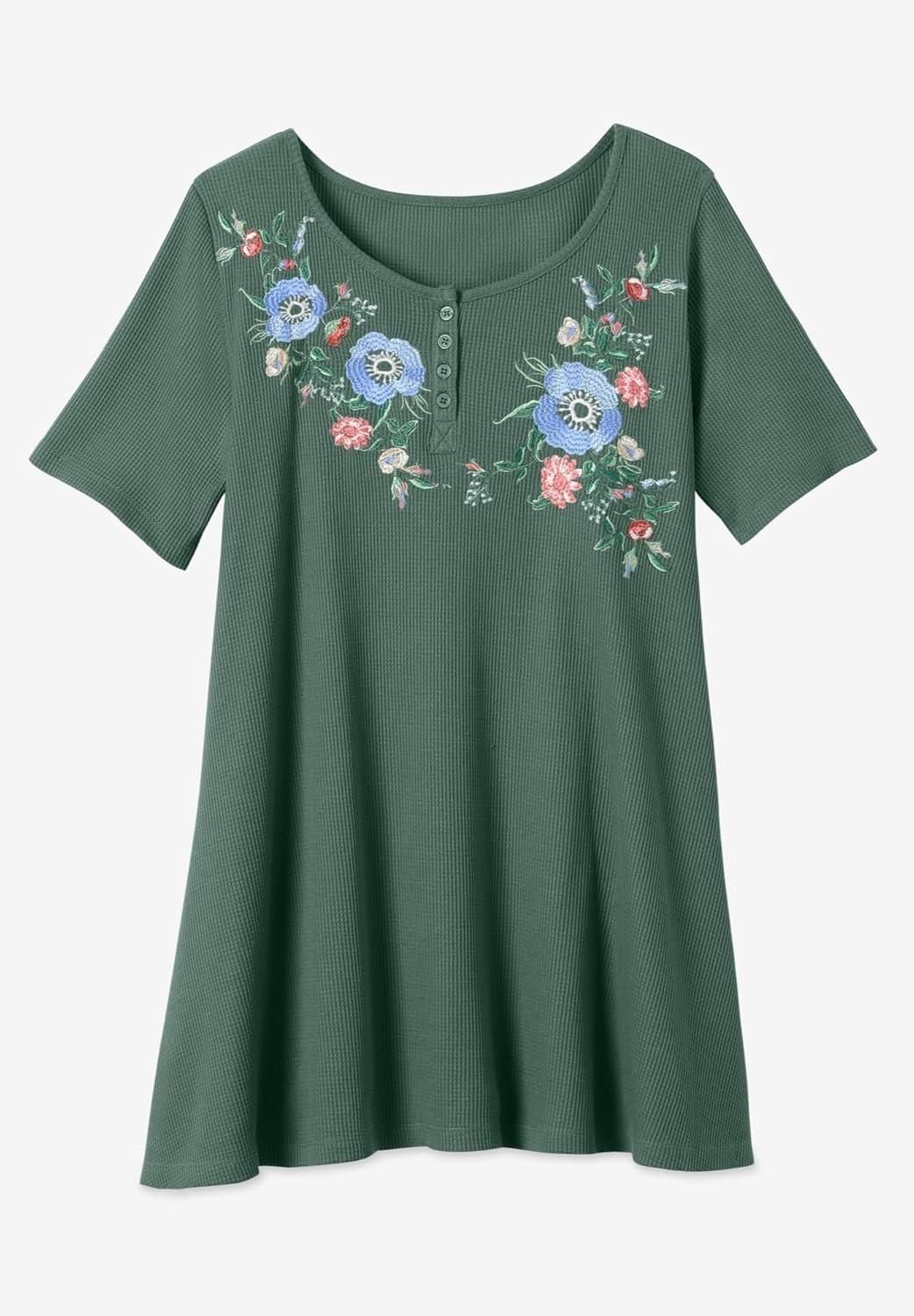 Woman Within Plus Size Embroidered Thermal Tunic(Pine Blooming Embroidery)