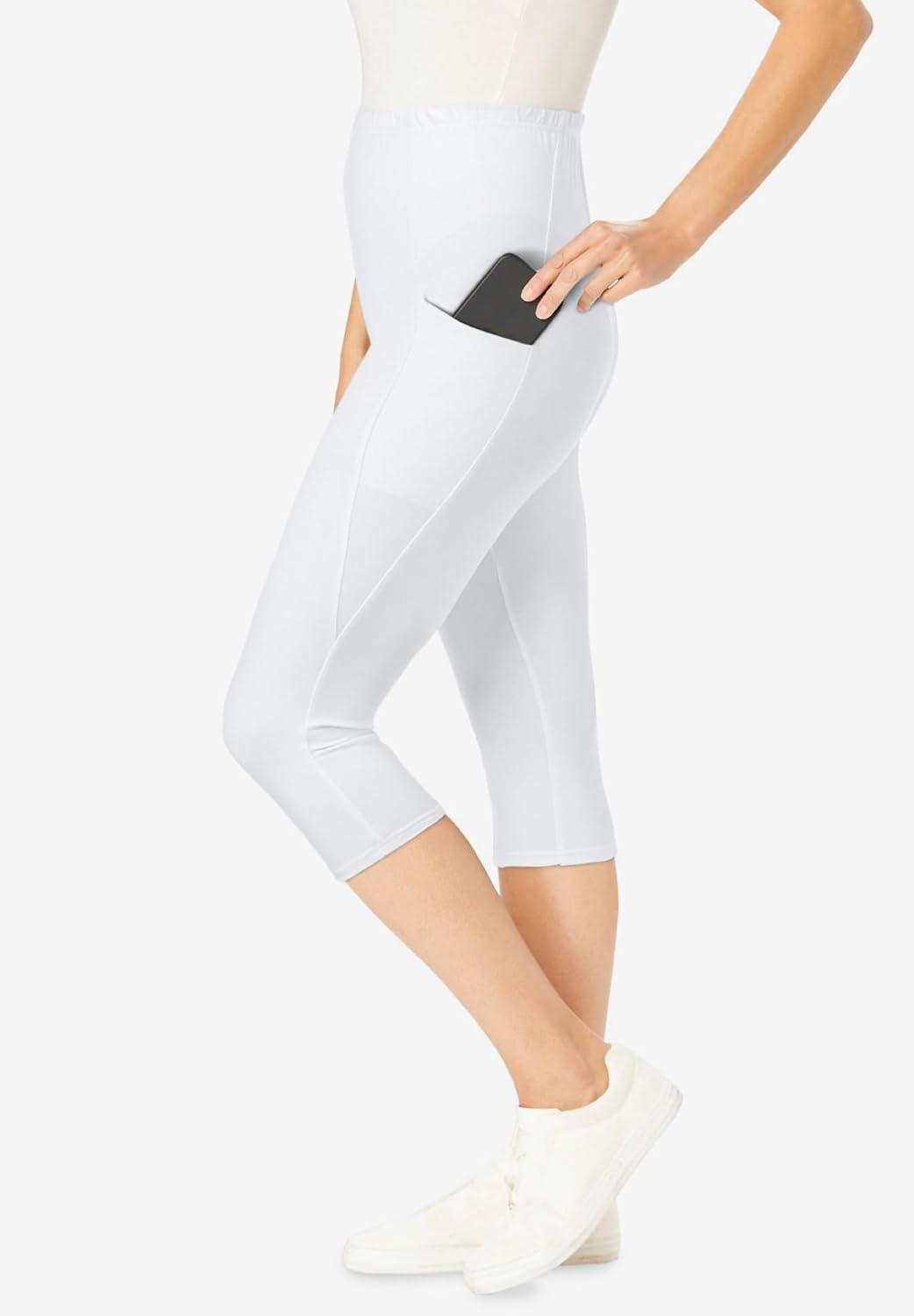 Woman Within Plus Size Petite Stretch-Cotton Knit Pull-On Pocket Capri Leggings(White)