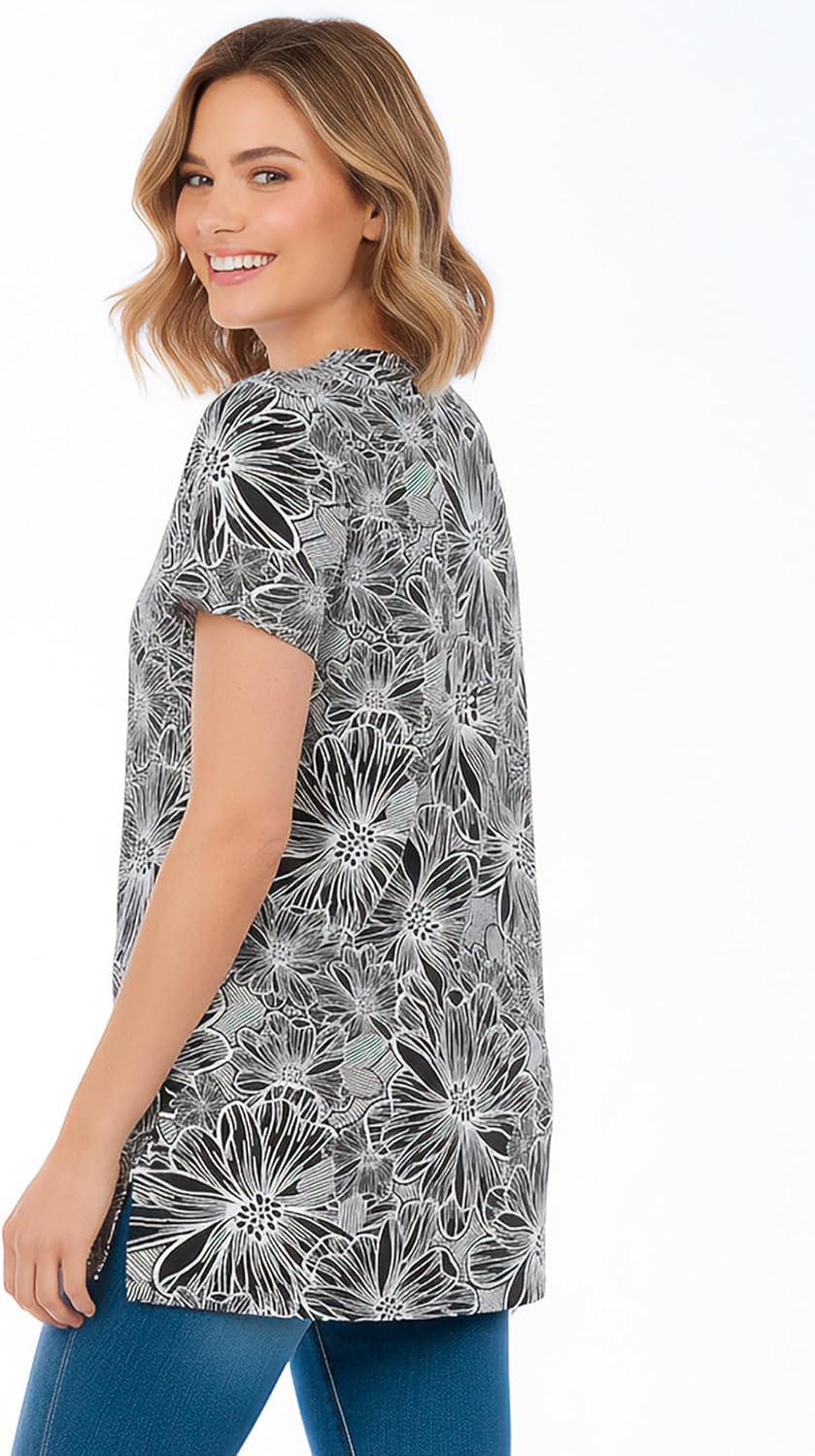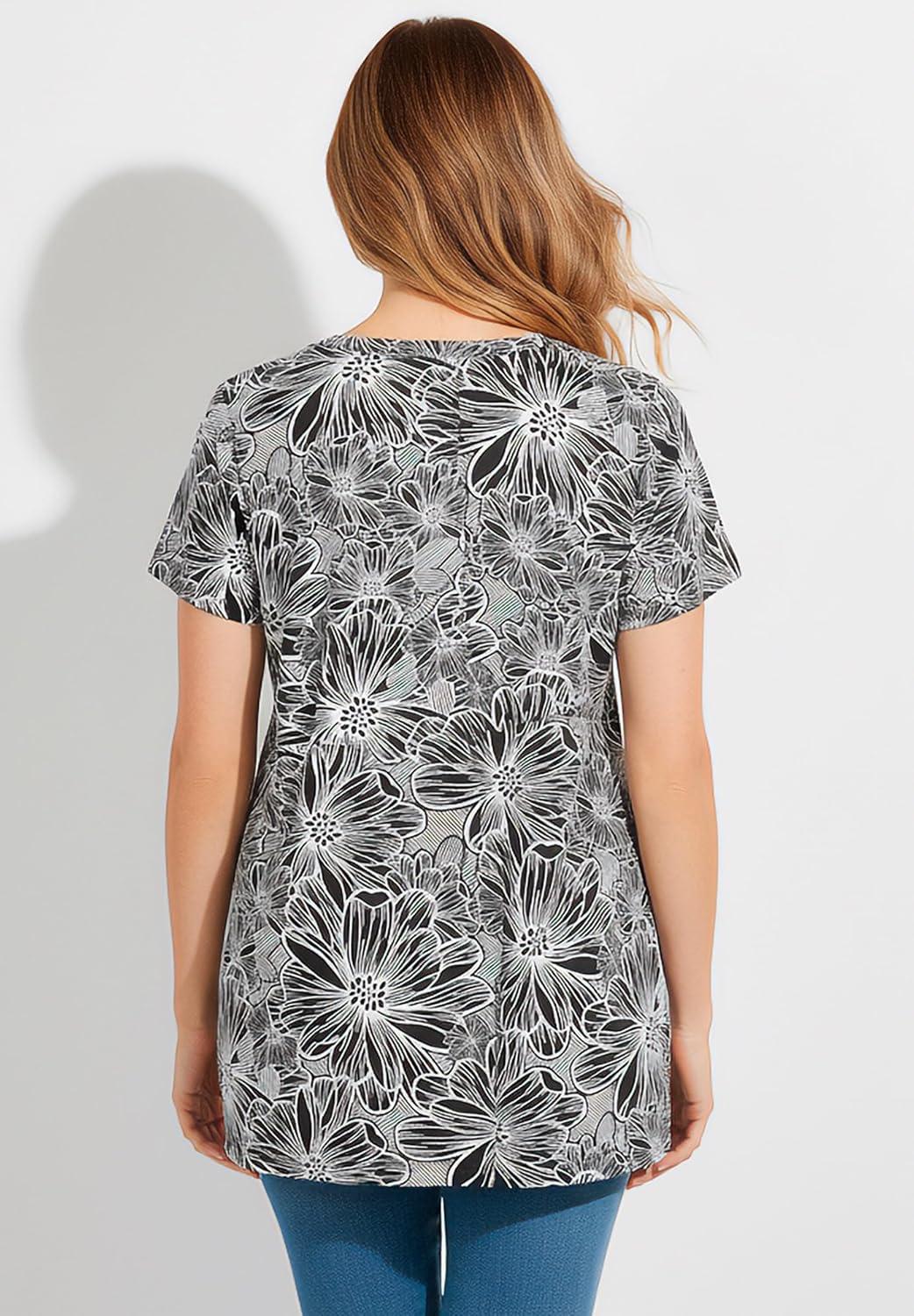 Woman Within Plus Size Perfect Printed Short-Sleeve Shirred V-Neck Tunic(Black Sketch Floral)