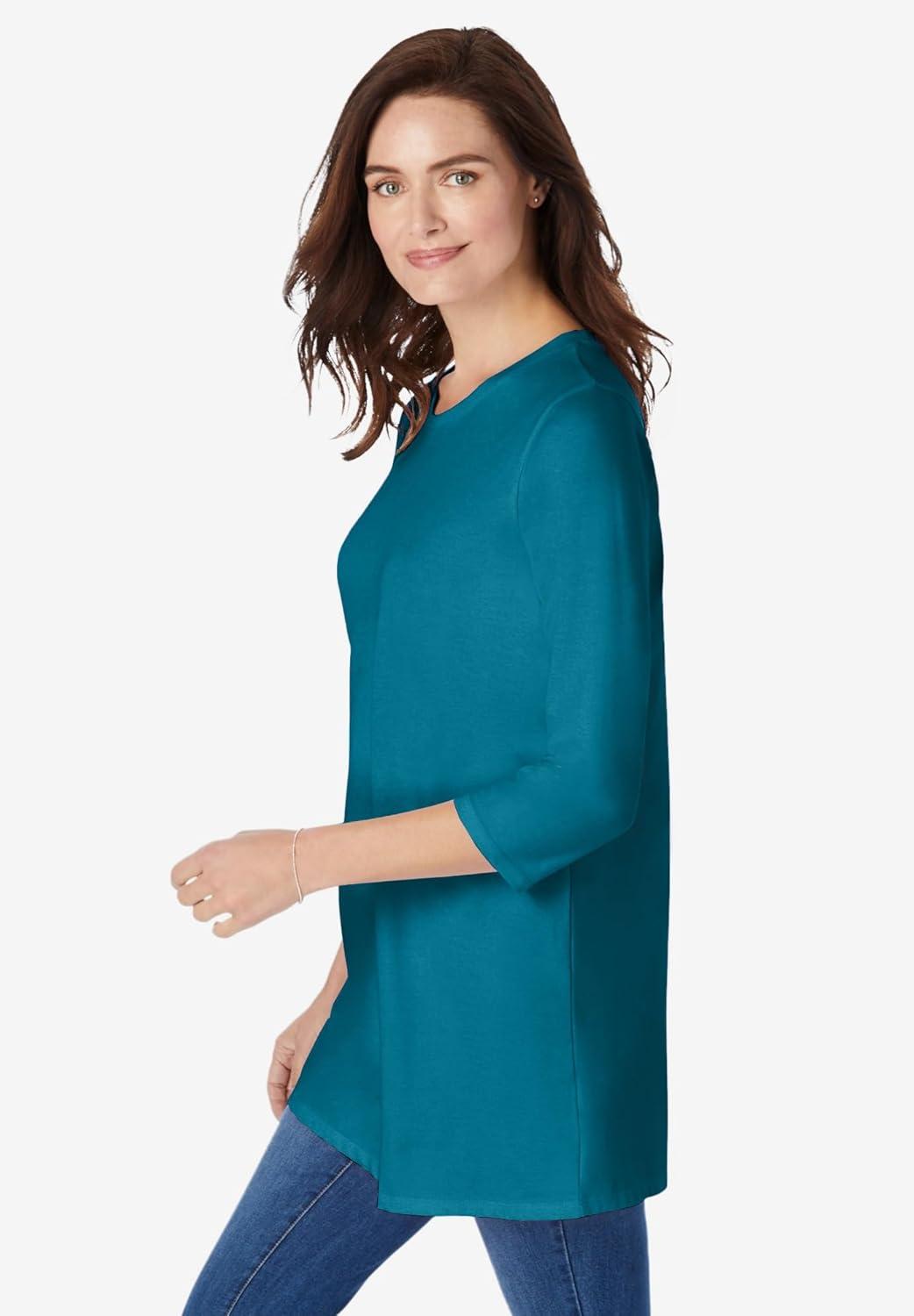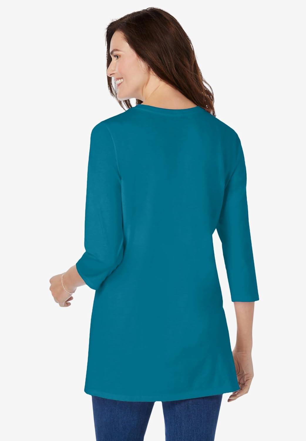 Woman Within Plus Size Perfect Three-Quarter Sleeve Crewneck Tunic(Deep Teal)