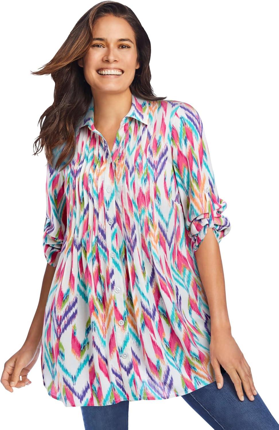Woman Within Plus Size Rayon Pintucked Effortless Tunic Blouse(Black Multi Batik)