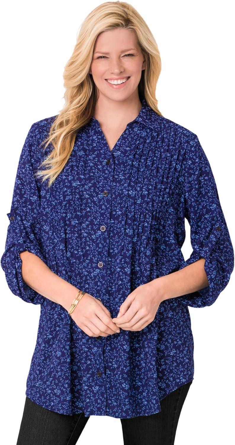 Woman Within Plus Size Rayon Pintucked Effortless Tunic Blouse(Navy Garden Print)