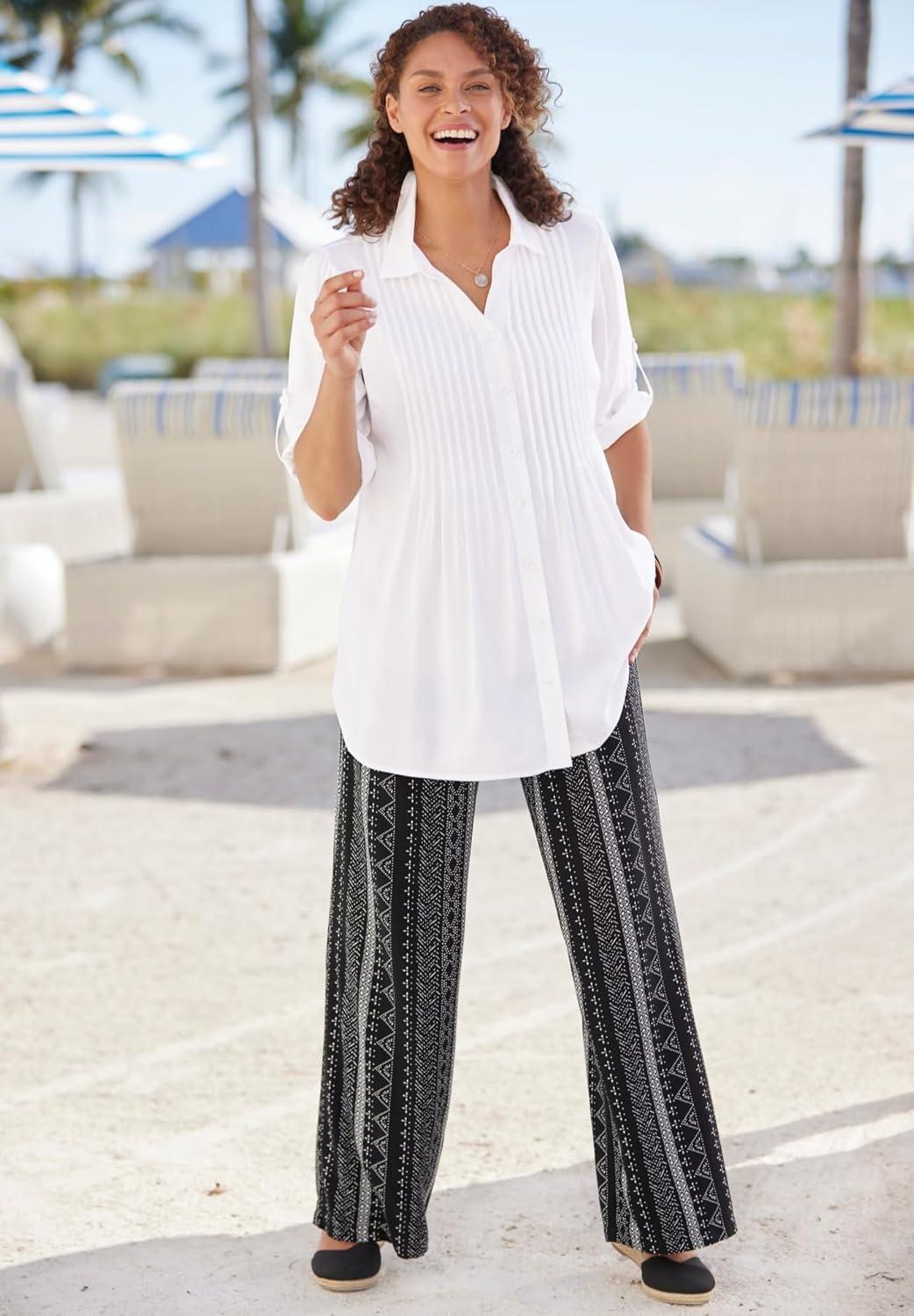 Woman Within Plus Size Rayon Pintucked Effortless Tunic Blouse(Black Magnolia)