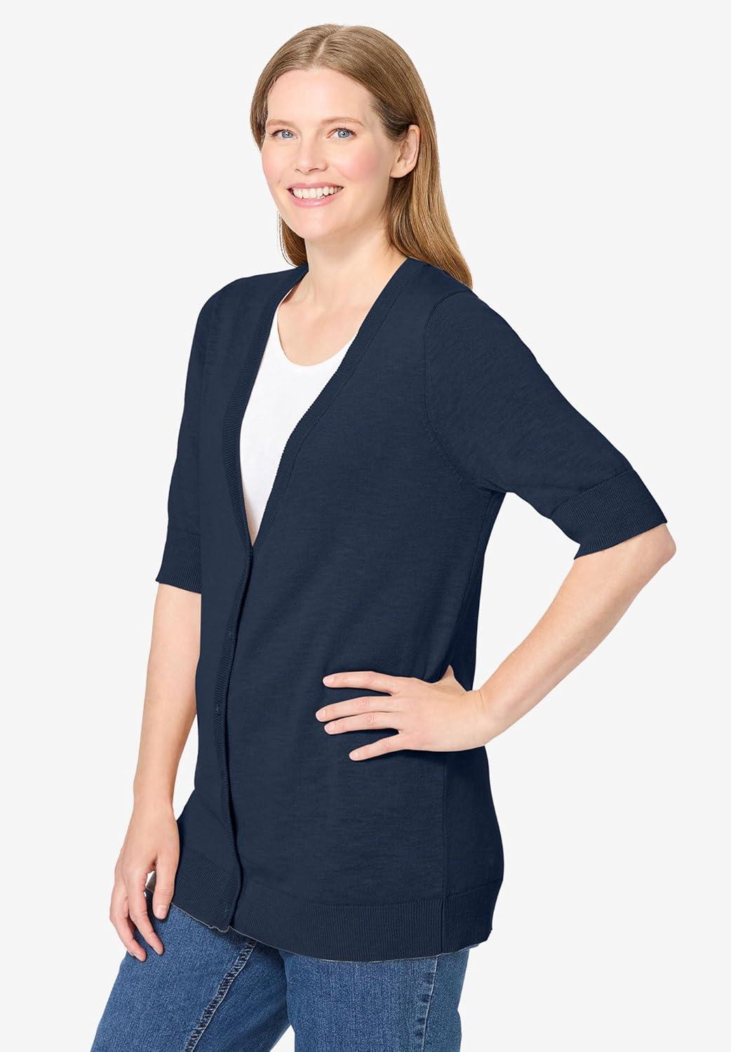 Woman Within Plus Size Lightweight Short Sleeve V-Neck Cardigan Sweater(Navy)