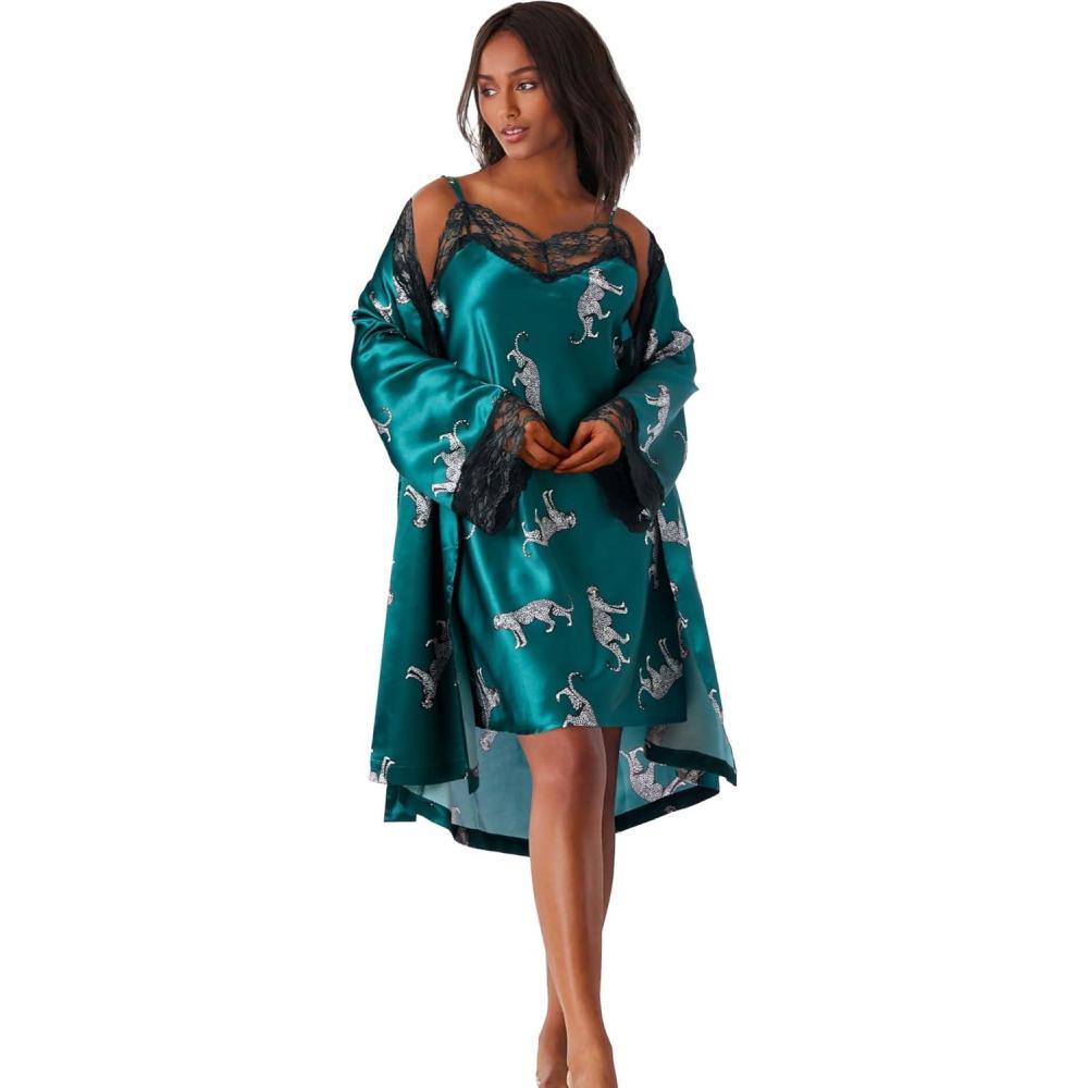 Amoureuse Plus Size The Luxe Satin Short Peignoir Set(Deep Emerald Leopard)