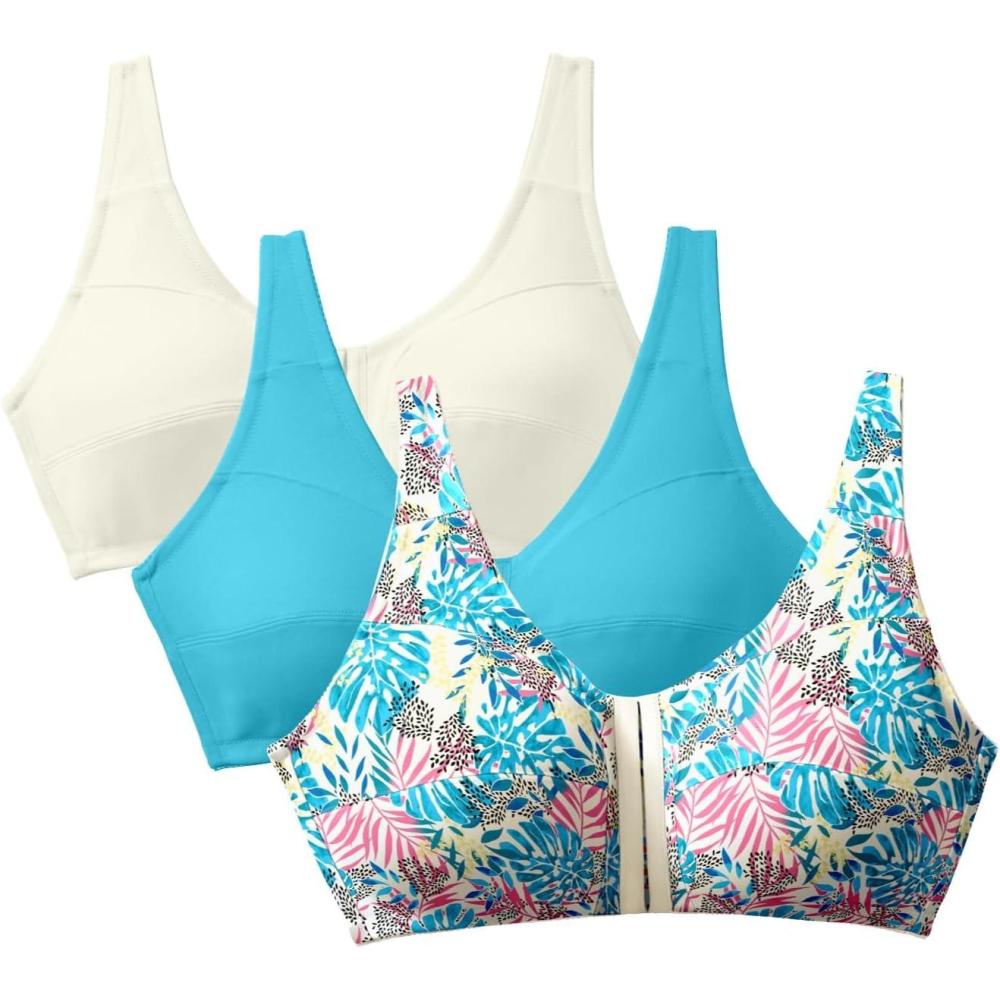 Comfort Choice Women’s Plus Size 3-Pack Front-Close Cotton Wireless Bra(Tropical Assorted)