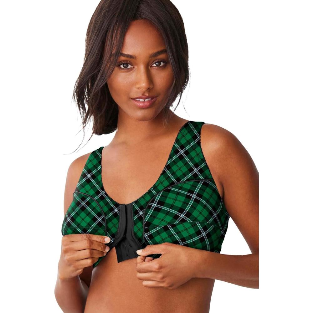 Comfort Choice Women’s Plus Size Cotton Front-Close Wireless Bra(Emerald Plaid)