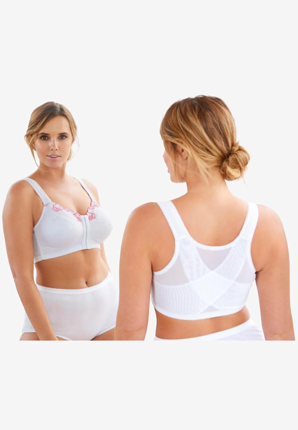 Comfort Choice Women’s Plus Size Front-Close Embroidered Wireless Posture Bra(Black Floral Embroidery)