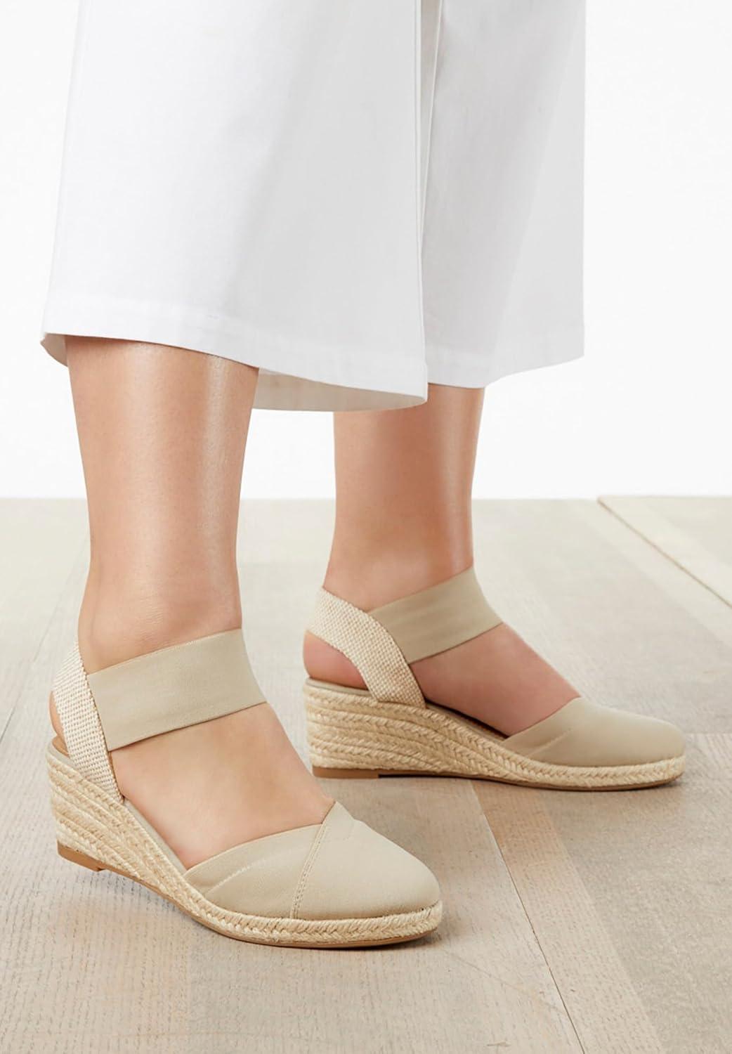 The perfect summer espadrille for easy warm-weather wear featuring a comfortable stretch upper and supportive ankle strap. Stretch upper and ankle strap Padded insole Skid-resistant outsole 1/2″ jute-wrapped platform; 2¼' stable jute-wrapped wedge heel Comfortable summer espadrilles available in full and half sizes 7-11, 12 M; 7-11, 12 W; 7-11, 12 WW