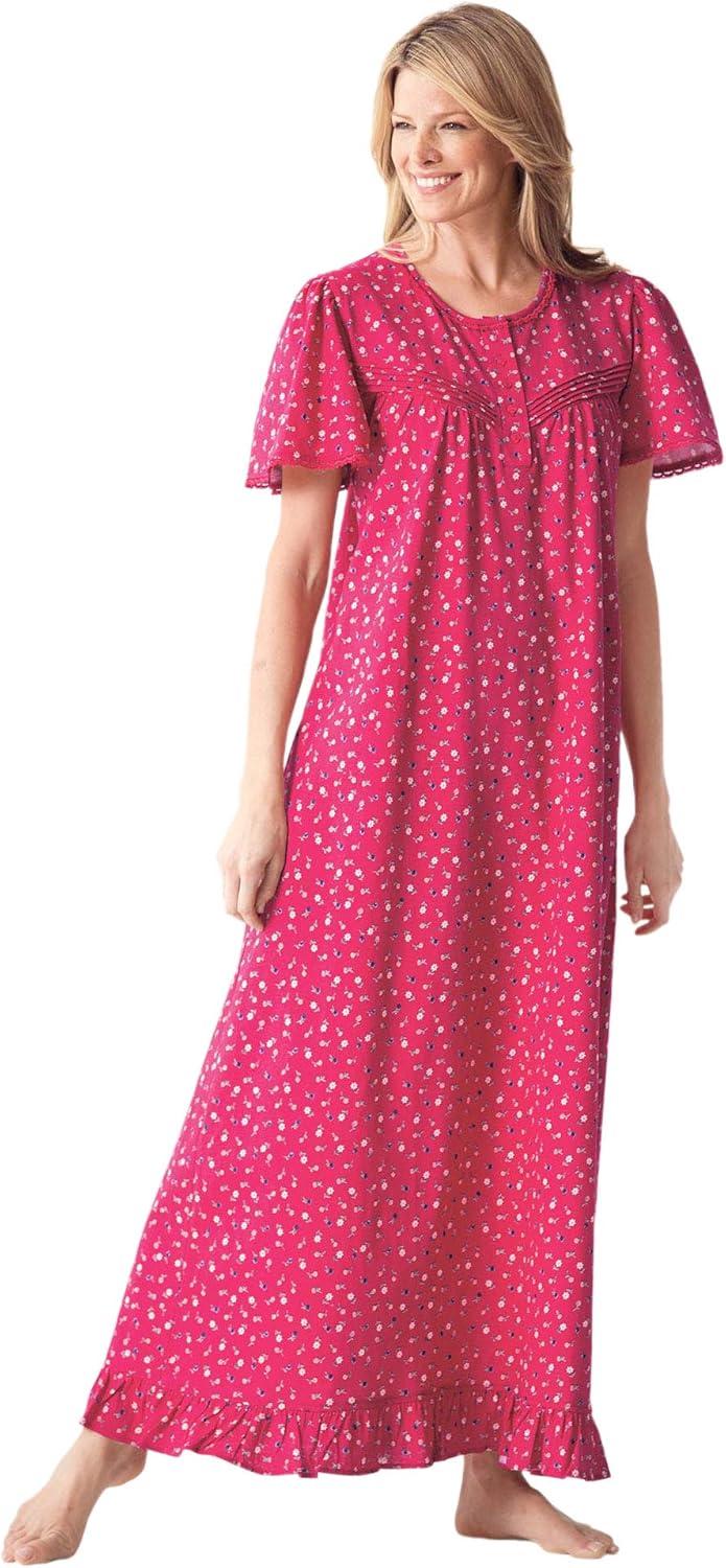 Enjoy cozy nights and relaxed mornings in this charming long floral print cotton gown.br>Made from 100% breathable, soft cotton for ultimate comfort and ease.br>Features delicate flutter sleeves and a ruffled hem for a feminine touch.br>Designed with an elegant A-line shape that flatters all body types.br>Detailed with front pintucks and flower-shaped buttons for added style.br>Available in a wide range of pretty patterns to suit your personal taste.br>Regular length gown measures 52″; Petite length measures 49″.br>Perfect for wearing around the house, cozying up on the couch, or staying warm at night.br>Machine washable for easy care.br>Imported