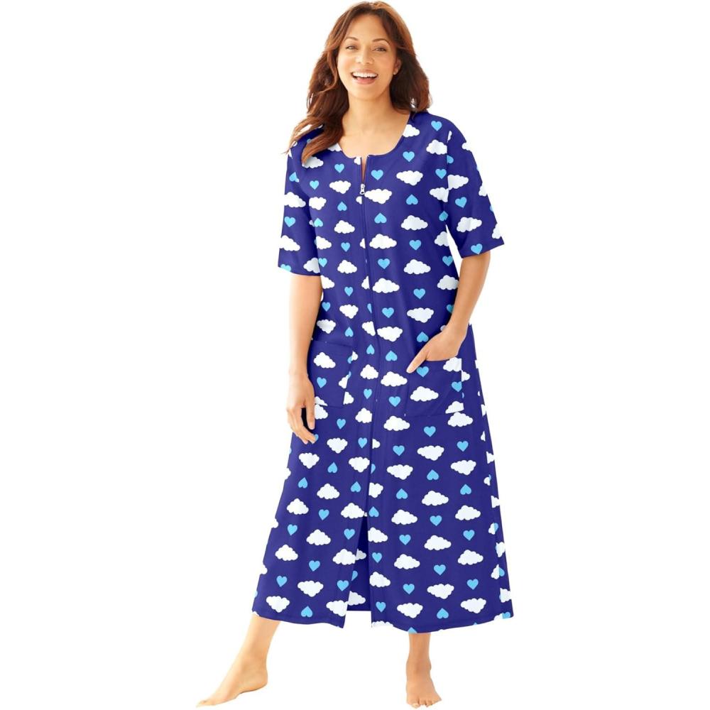 Dreams & Co. Women’s Plus Size Long French Terry Zip-Front Robe (Petite Available)(Ultra Blue Clouds)